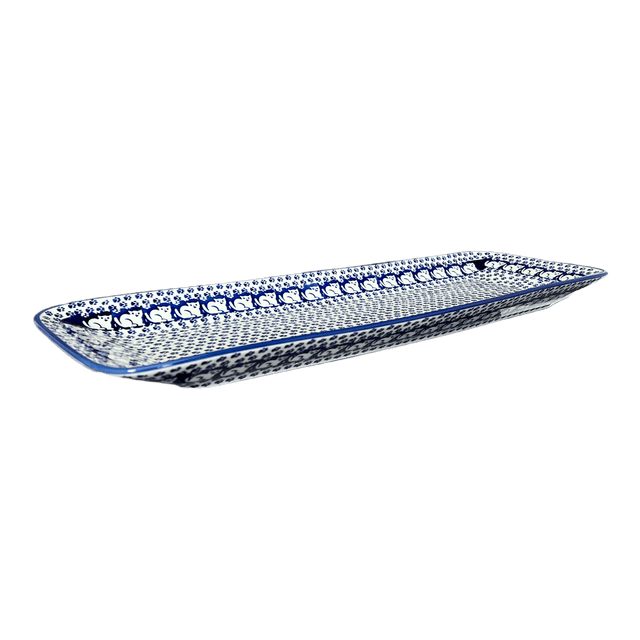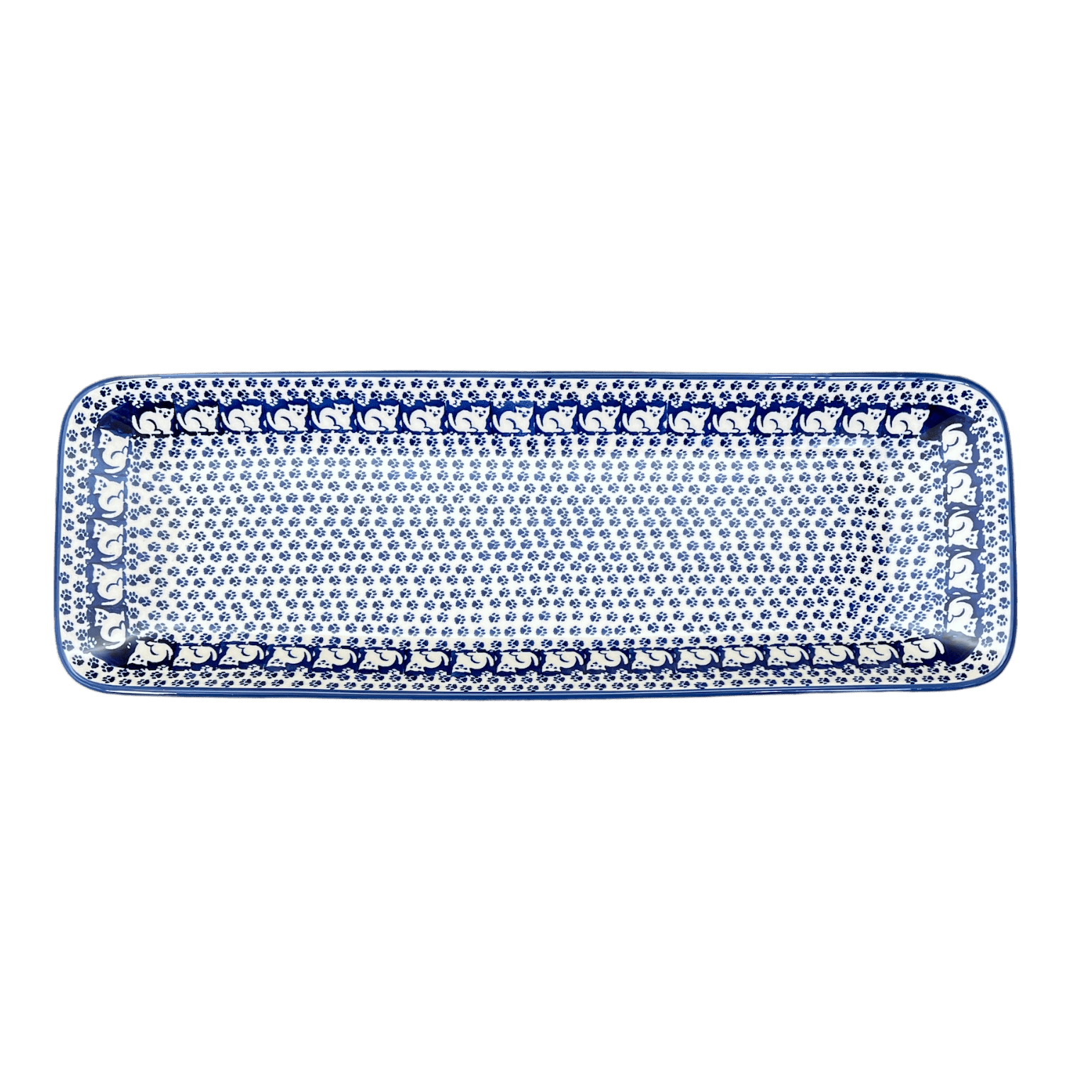 Introducing the stunning Polish Pottery 19.5" x 6.75" Rectangular Platter by Manufaktura, now available in the playful "Kitty Cat Path" pattern (KOT6)! These long, rectangular serving trays are not only gorgeous, but they are also incredibly versatile. Whether you're serving hors d'oeuvres, bread, cheese and crackers, pastries, meats, or desserts, this platter has got you covered!