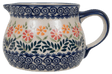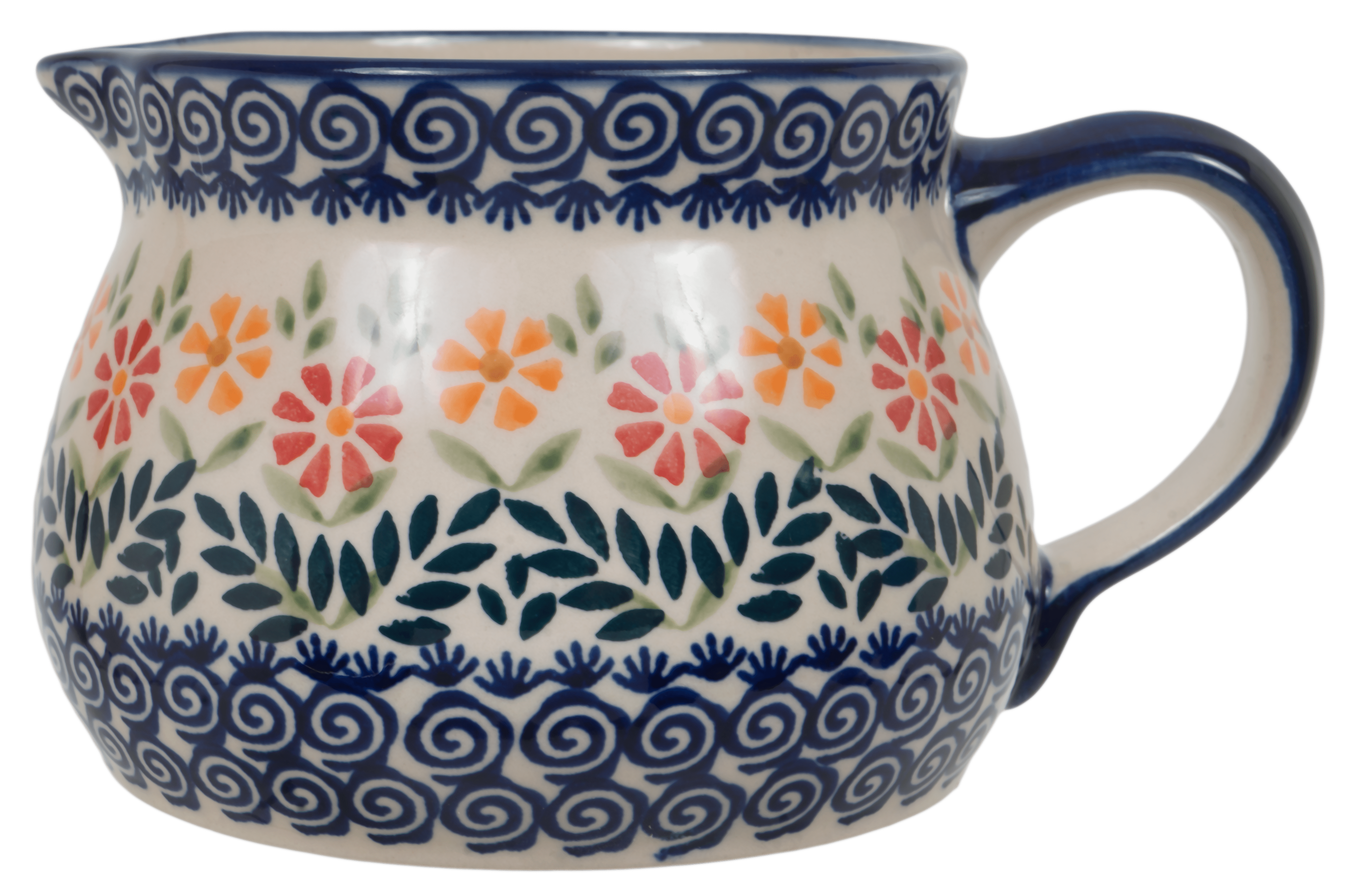 The "Flower Power" pattern of this pitcher is a vivid tapestry of nature-inspired elements. Set against a crisp white background, swirls of blue dance around a ring of lush green leaves. Radiant red and orange flowers bloom boldly, creating a visual feast that is both enchanting and cheerful. Each pitcher is handcrafted by skilled artisans in Boleslawiec, Poland, using traditional hand-stamping techniques. This method not only imbues each piece with unique character but also celebrates the rich heritage and craftsmanship of Polish pottery. No two pitchers are exactly alike, making each one a special keepsake.