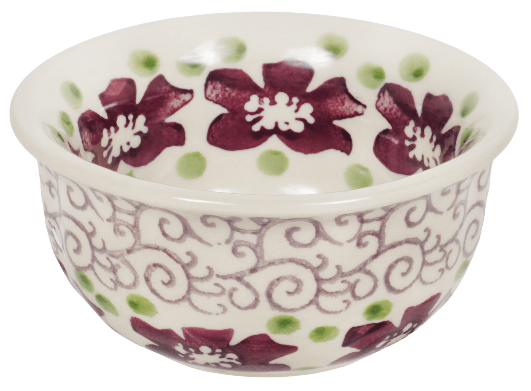Imagine a touch of elegance and tradition gracing your table with the enchanting Manufaktura Polish Pottery Bowl. Crafted in the heart of Boleslawiec, Poland, this 3.5-inch bowl, adorned in the captivating "Merlot Garden" pattern, is not just a dish but a piece of art. The delightful design showcases a white background with whimsical light gray swirls at the center, encircled by a band of rosy brown flowers. Small lime green dots playfully dot the edge, bringing a burst of color and joy to any setting. Perfect as a ramekin or dipping bowl, its slightly scalloped sides add a hint of sophistication to its charming allure.