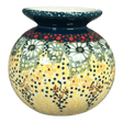 Introducing the charming Polish Pottery Vase from Manufaktura, a delightful treasure standing at a petite 3.75 inches. This small but mighty vase, enveloped in the vibrant "Sunshine Grotto" pattern, captures the essence of a sun-drenched meadow. Adorned with a bright yellow backdrop and festooned with light green and white floral accents, the design also features whimsical teal dots arranged in triangular clusters, pointing like arrows towards the heart of the vase. Tiny orange flowers dance near the base, adding a splash of fiery color to this enchanting piece. Crafted by the skilled artisans of Boleslawiec, Poland, each vase not only holds flowers but also the heart and soul of its creator.