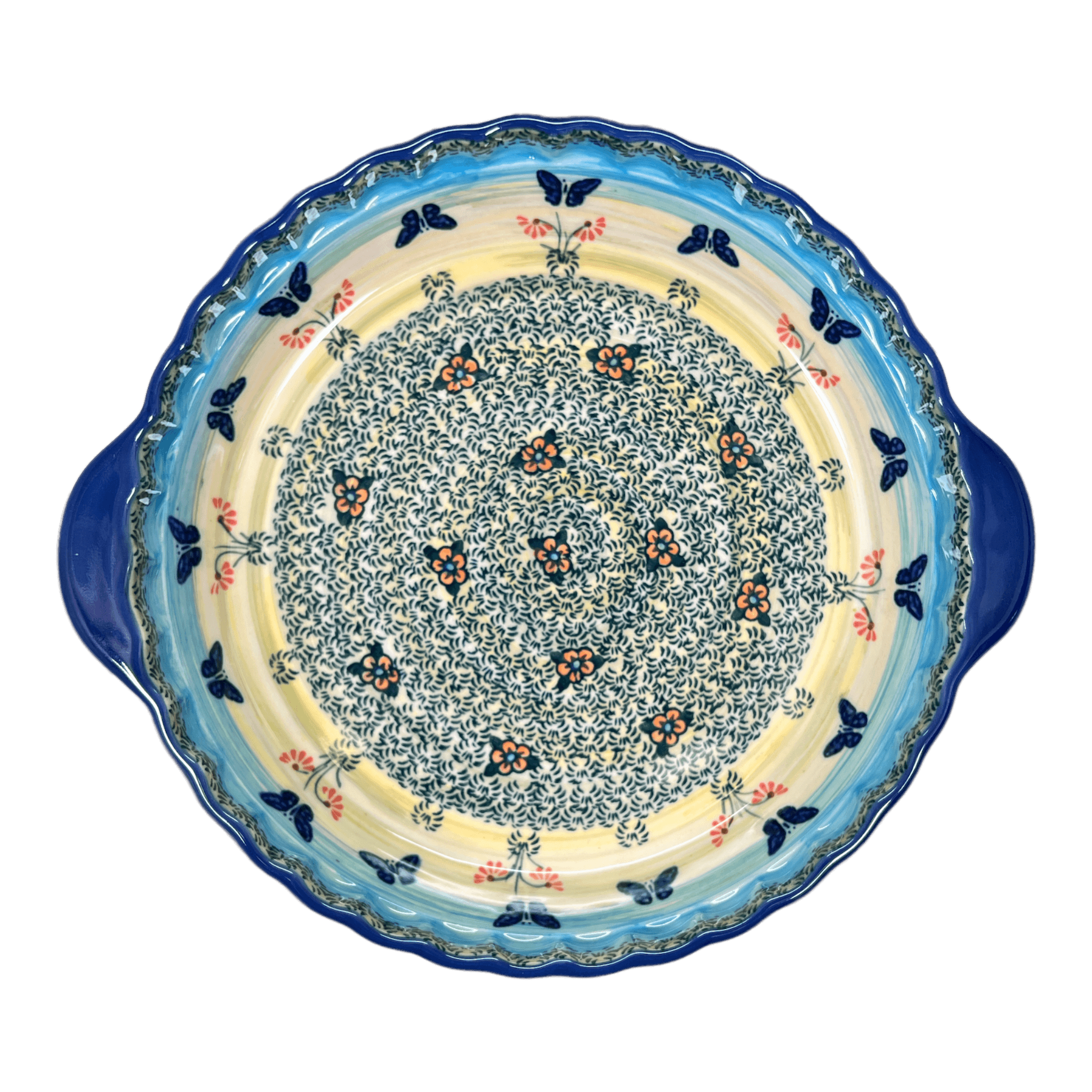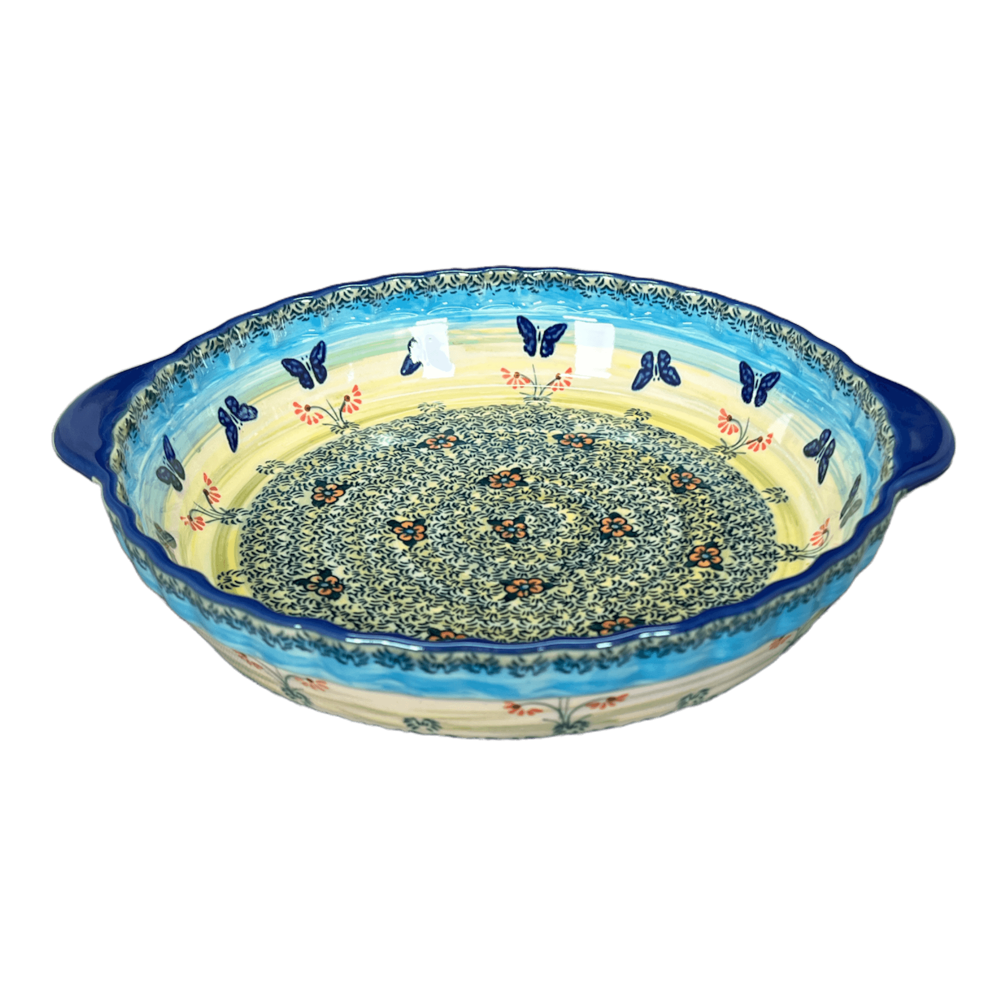 Imagine the charm of a sunny European kitchen right in your home with the exquisite "Butterflies in Flight" Polish Pottery Pie Plate. Handcrafted by the revered artisans of Manufaktura in Boleslawiec, Poland, this 9.75" pie plate is more than just a baking dish—it's a slice of artistic heritage. Each plate boasts a vibrant, whimsical pattern of dark blue butterflies fluttering around tiny orange blossoms and detailed grass tufts, set against a joyful backdrop of yellow, white, and light green bands. This isn't just a dish; it's a gateway to transforming your baking into a display of culinary art.