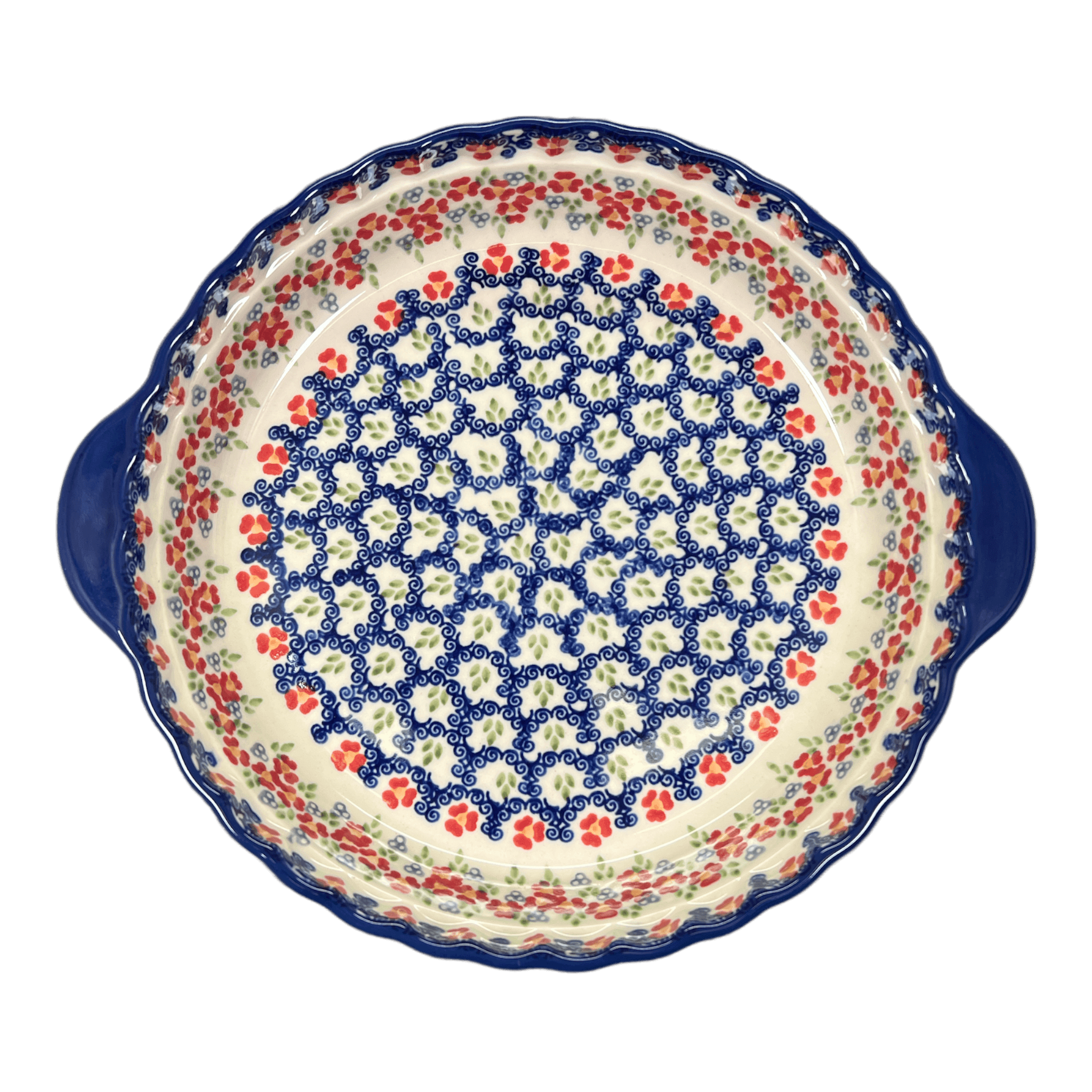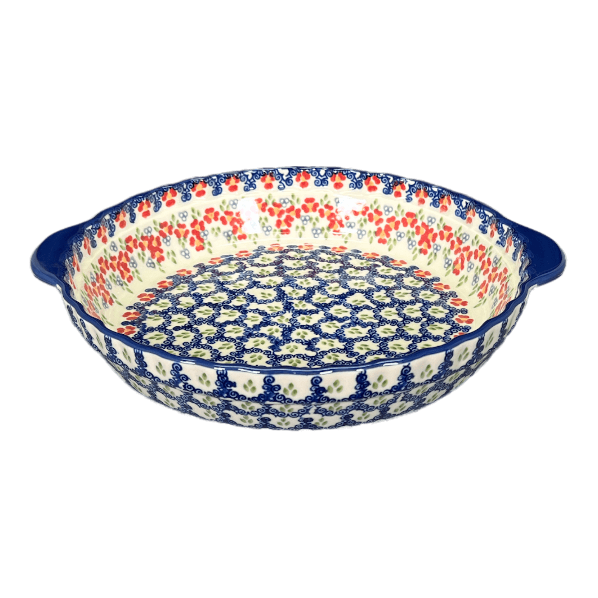 Imagine pulling a perfectly baked pie from the oven, the aroma filling your kitchen with mouthwatering anticipation. Now picture that pie nestled within the exquisite confines of the Manufaktura Polish Pottery Pie Plate. This isn't just any pie plate—it's a masterpiece of culinary artistry, adorned with the charming "Ring Around the Rosie" pattern. A dance of vibrant red flowers, lush green tufts, and playful blue swirls set against a crisp white background, this design doesn’t just hold your delicious creations; it enhances them. Each piece, measuring a generous 9.75 inches, is meticulously hand-painted in Boleslawiec, Poland, by artisans whose skill transforms every pie into a celebration of flavor and beauty.
