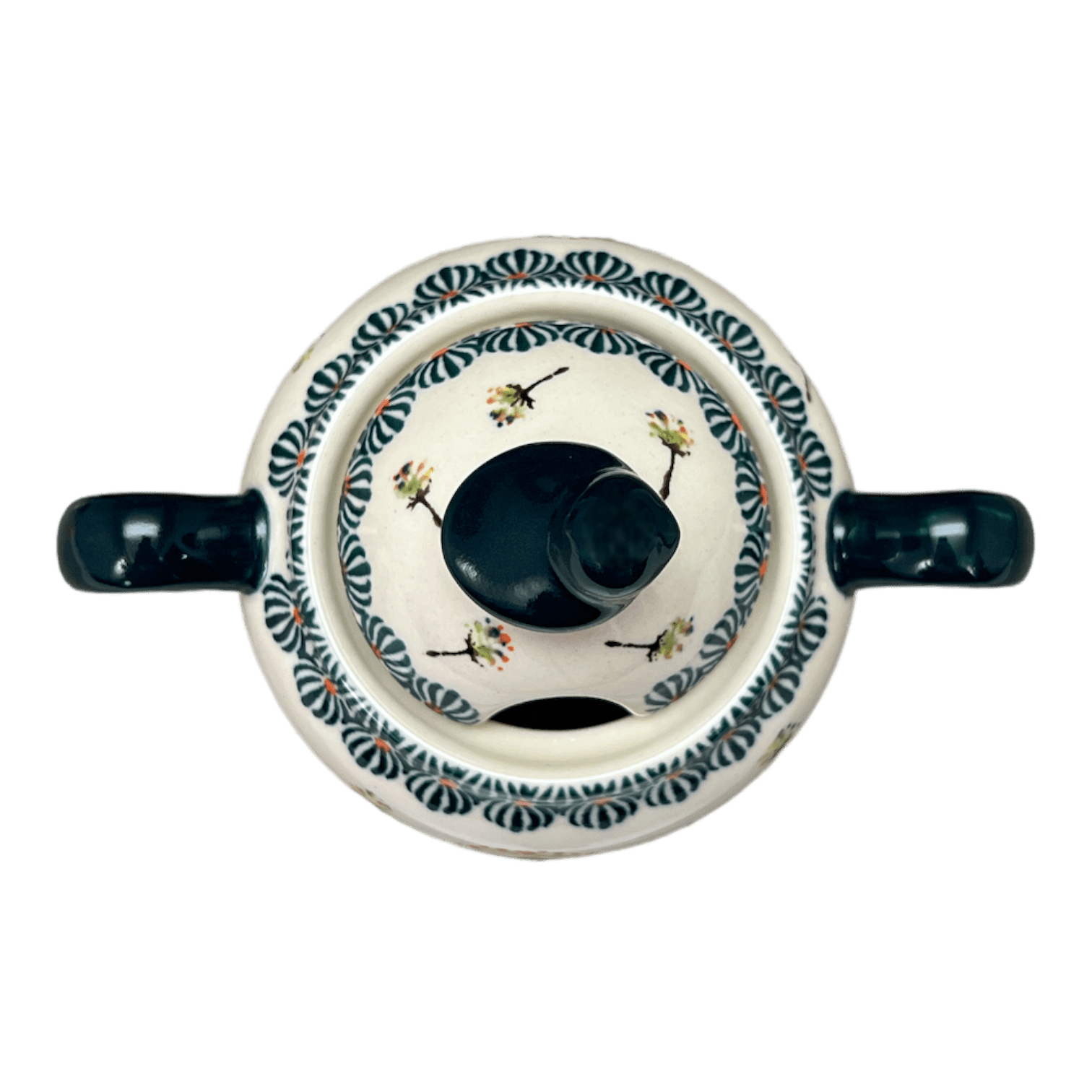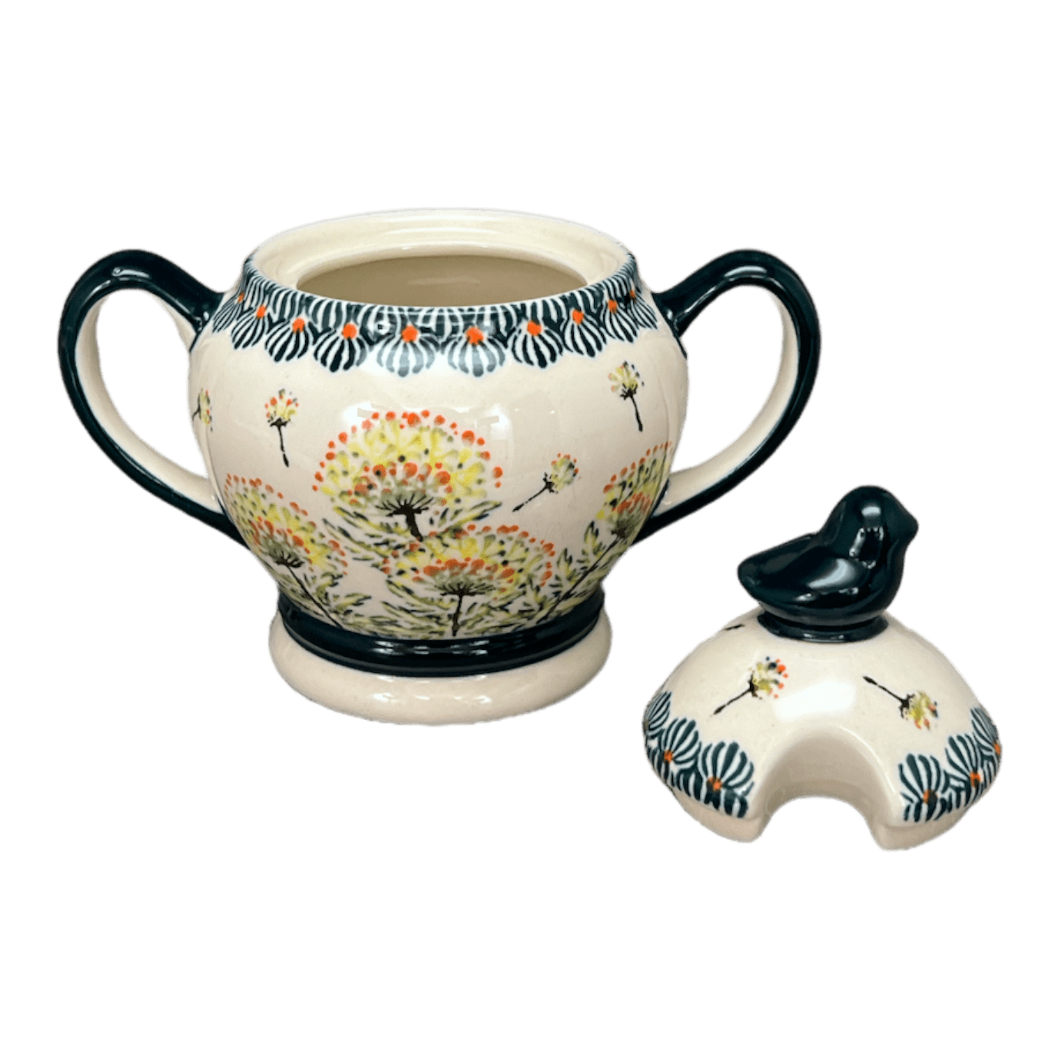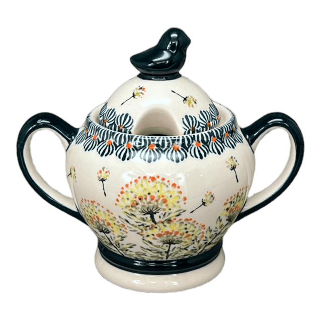 Introducing the enchanting Zaklady Polish Pottery Sugar Bowl, a delightful masterpiece adorned with the playful "Dandelions" pattern. This charming sugar bowl brings a whimsical touch to your kitchen with its intricately hand-painted dandelions dancing across a pristine white background. Each flower, painted in vibrant shades of yellow, green, and orange, seems to sway on its slender green stem, while fluffy dandelion tufts appear to float mid-air. But the real pièce de résistance? A cute little bird perched atop the lid, overseeing your sweetest concoctions with a watchful eye. This sugar bowl doesn't just store your sugar; it tells a story of spring and cheer in every scoop!