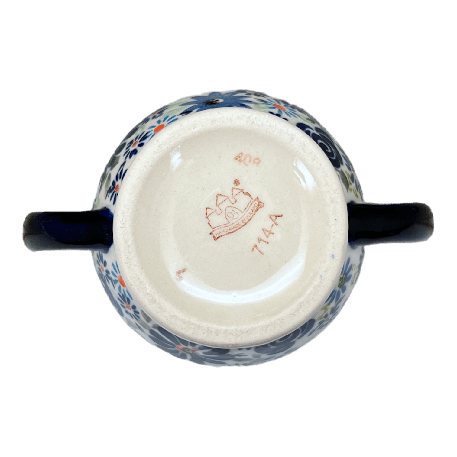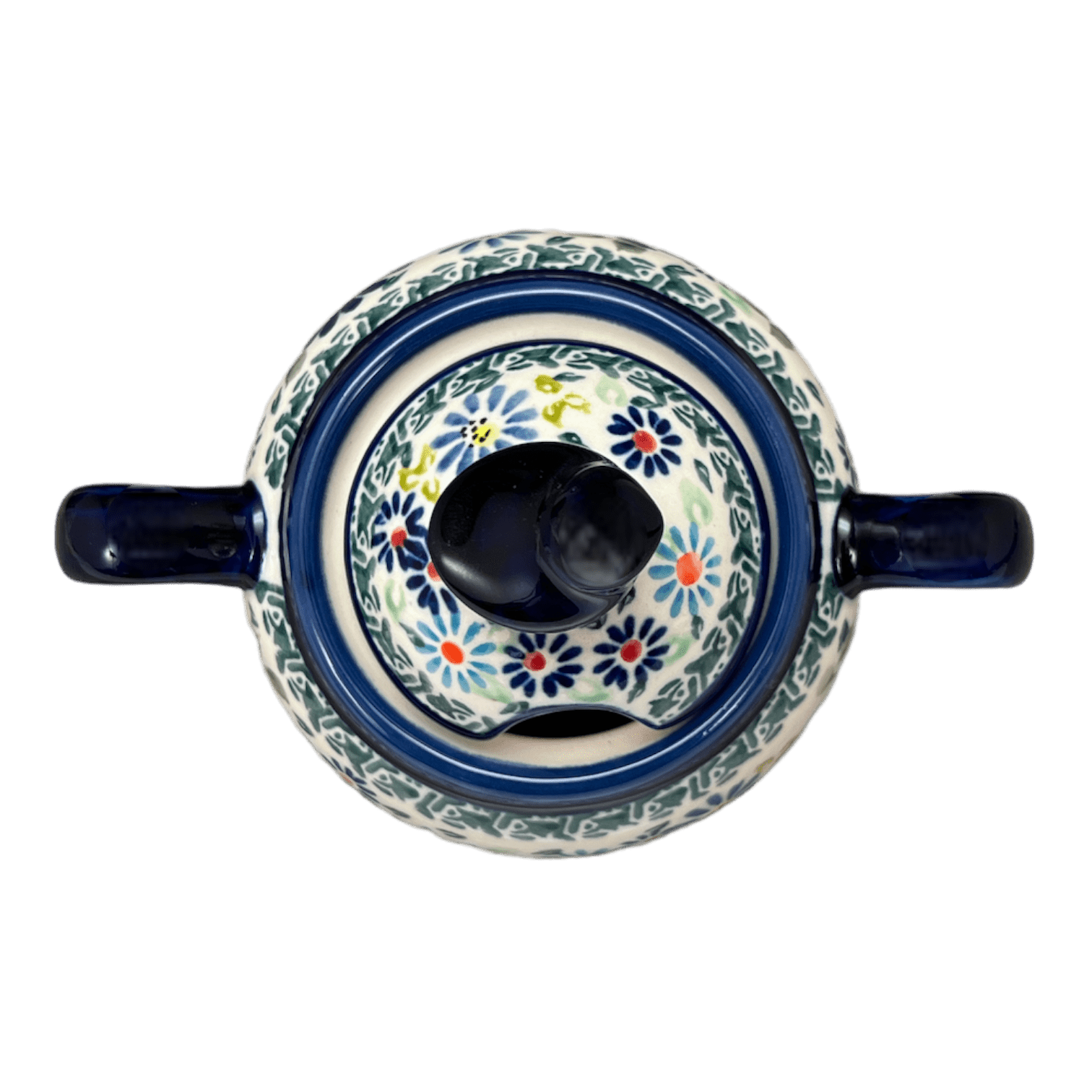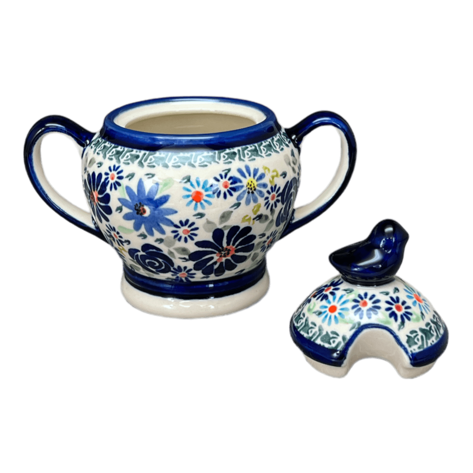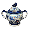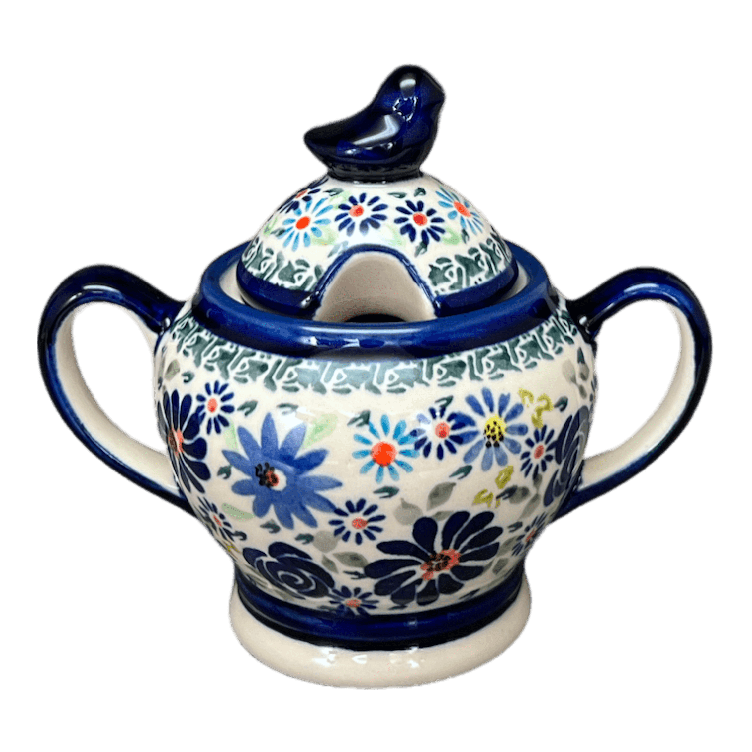 Imagine a delightful burst of color on your kitchen counter that not only stores your sugar but also steals the spotlight! The Zaklady Polish Pottery Sugar Bowl, adorned with the enchanting "Floral Explosion" pattern, brings just that magic. Crafted in Boleslawiec, Poland, this charming piece features a whimsical bird perched atop its lid, a delightful touch that promises to bring a smile with every use. The design blooms with large dark blue flowers sporting vibrant orange centers, surrounded by an array of smaller blossoms in soothing shades of blue, complemented by lush green leaves and a matching border. It's not just a sugar bowl; it's a centerpiece that invites conversation and admiration.