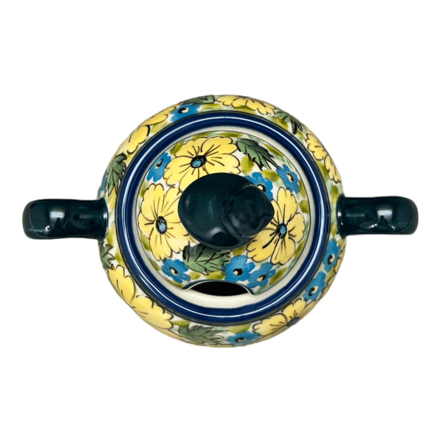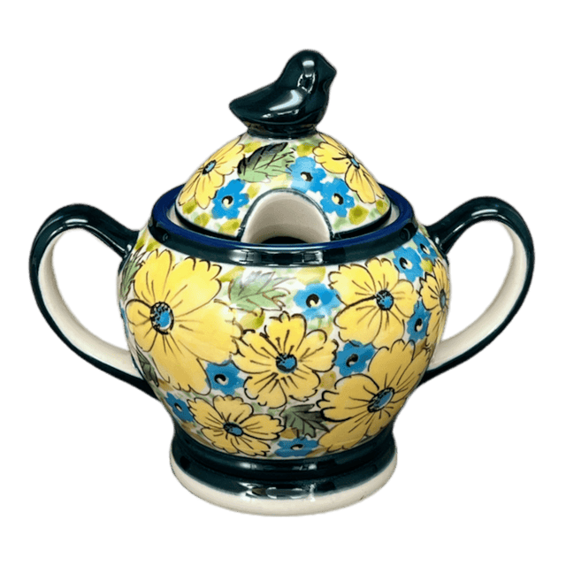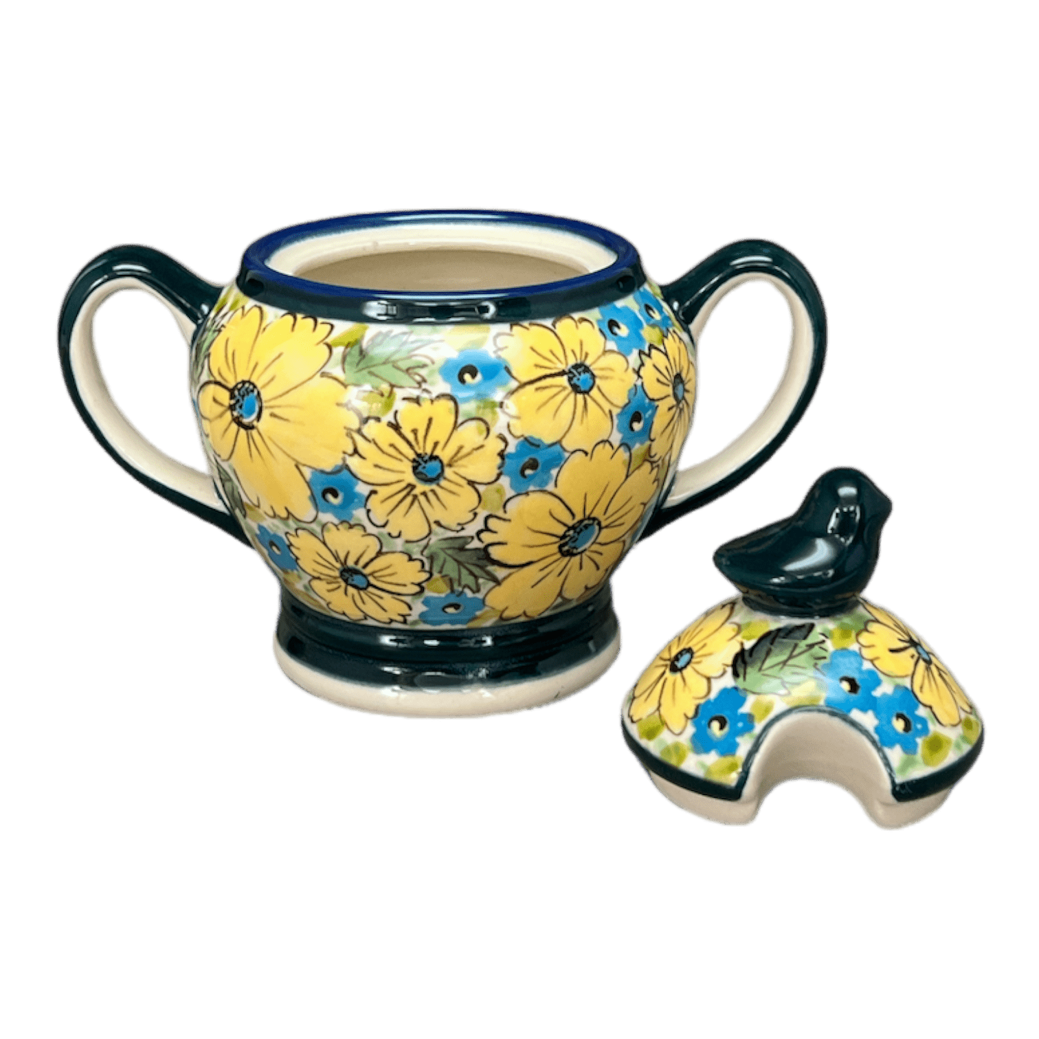 Imagine a delightful splash of sunshine on your kitchen counter with the Zaklady Polish Pottery Sugar Bowl, where artistry meets practicality in a charming "Sunny Meadow" design. This enchanting sugar bowl isn't just a container; it's a mini masterpiece, adorned with vibrant yellow flowers and playful blue blooms nestled against a lush green backdrop. But the crowning glory? A quaint little bird perched atop the lid, overseeing your sweetest moments. Every glance at this bowl promises to bring a smile, transforming the simple act of sweetening your tea into a whimsical experience.