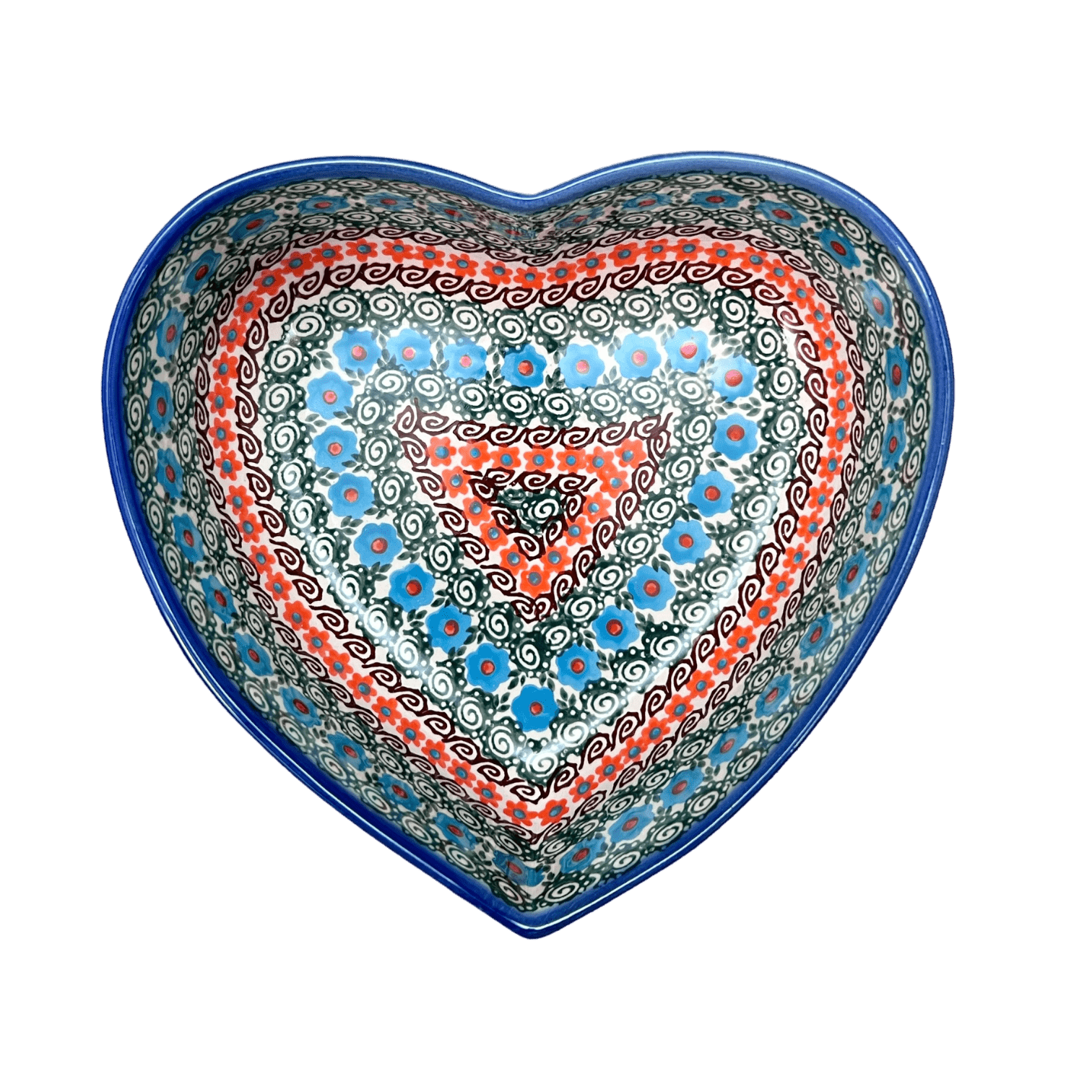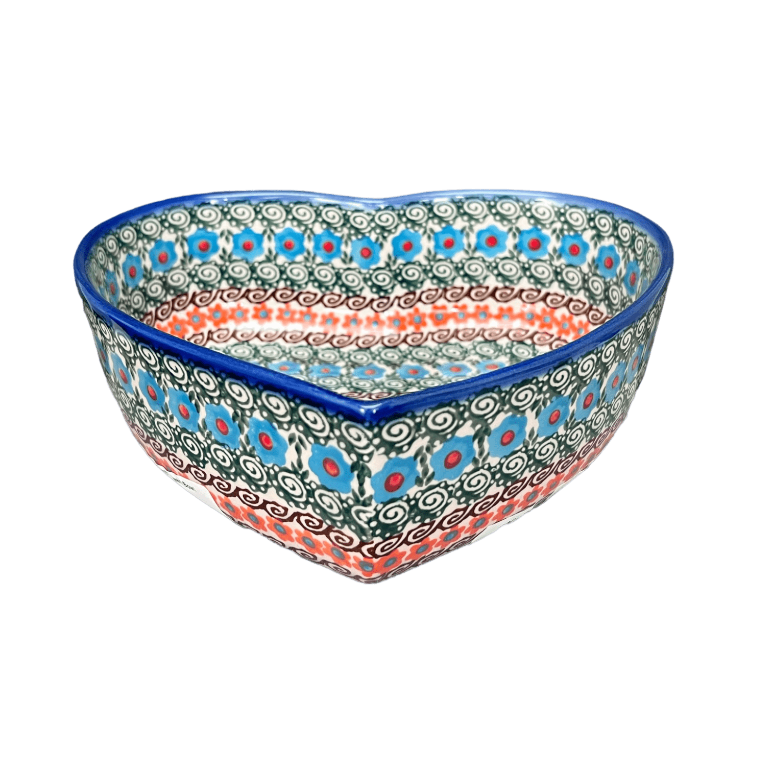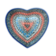 Introducing the enchanting "Teal Pompons" heart-shaped bowl, a delightful masterpiece crafted by the renowned Andy from the quaint town of Boleslawiec, Poland. This 8" x 8.75" bowl is not just a dish but a celebration of art, bursting with vibrant colors and intricate designs that bring the traditional Polish pottery to life. Whether it's a steaming heap of your favorite side dish, a tempting dessert, or just holding fresh fruits, this bowl serves up style along with functionality. Each glance at its floral spirals and radiant hues of teal, green, and orange promises to transport you to a world of rustic charm and elegance.