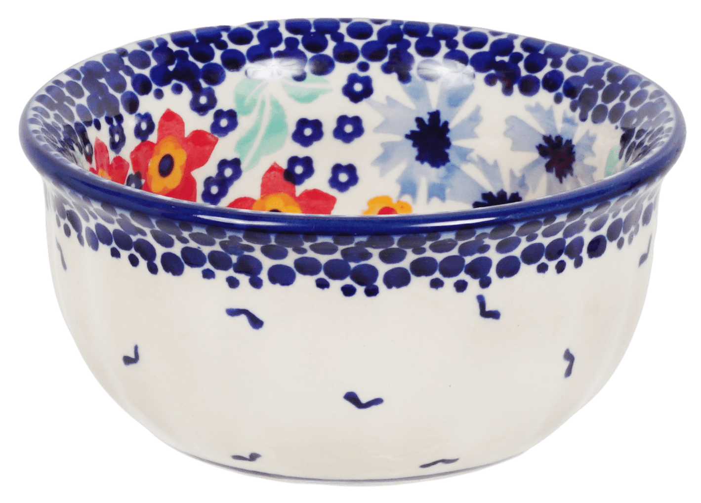 Step into a world where everyday objects transform into vibrant masterpieces with the Polish Pottery Bowl from Manufaktura. Crafted in the heart of Boleslawiec, Poland, this delightful 4.5" bowl is a burst of color and artistry, perfect for brightening up your dining table. The "Brilliant Garden" pattern is an enchanting canvas of red, yellow, blue, and cadet gray flowers, all beautifully arrayed against a crisp white background. Not just a bowl, but a gateway to a blooming garden, this piece invites you to dip into your favorite condiments or sauces in style!