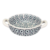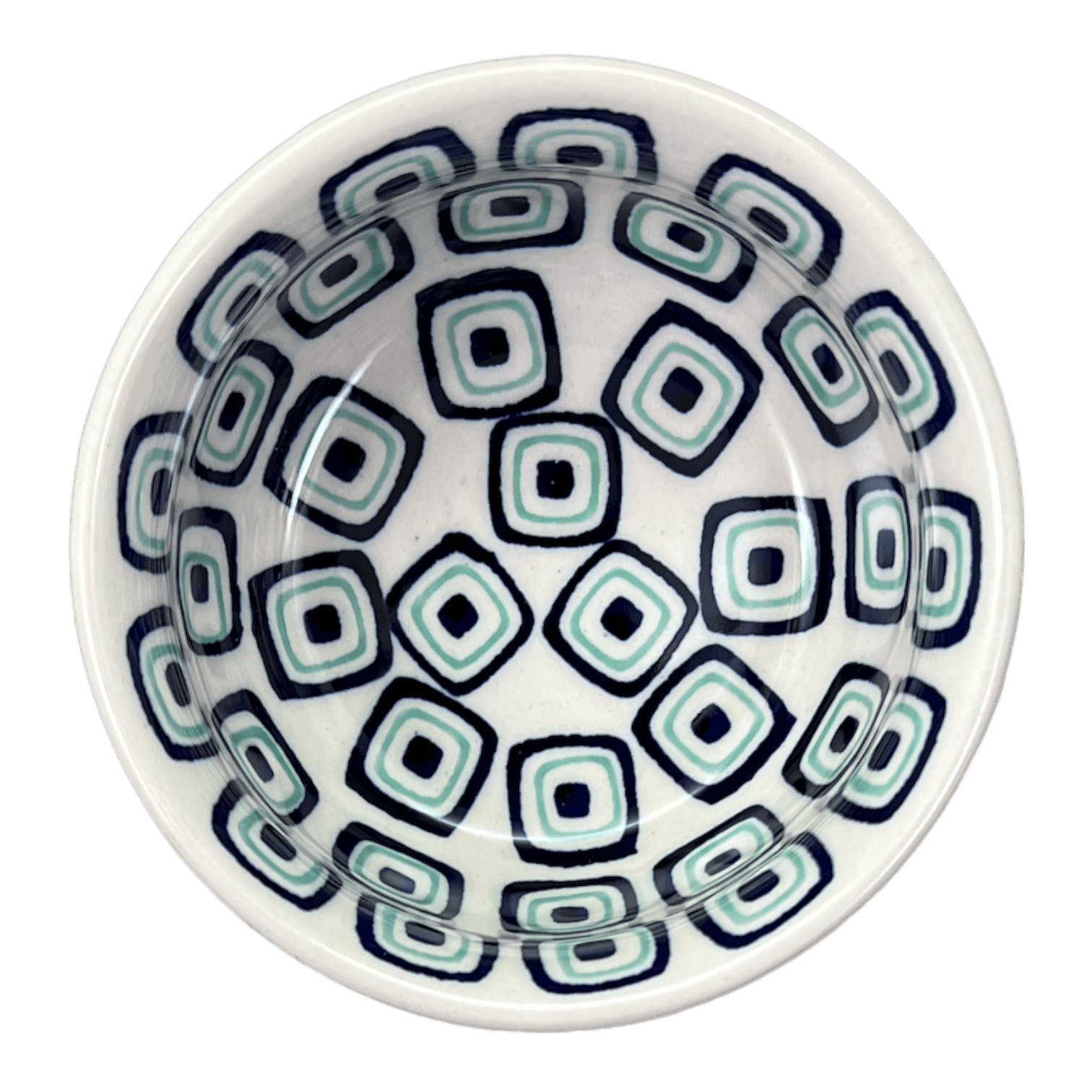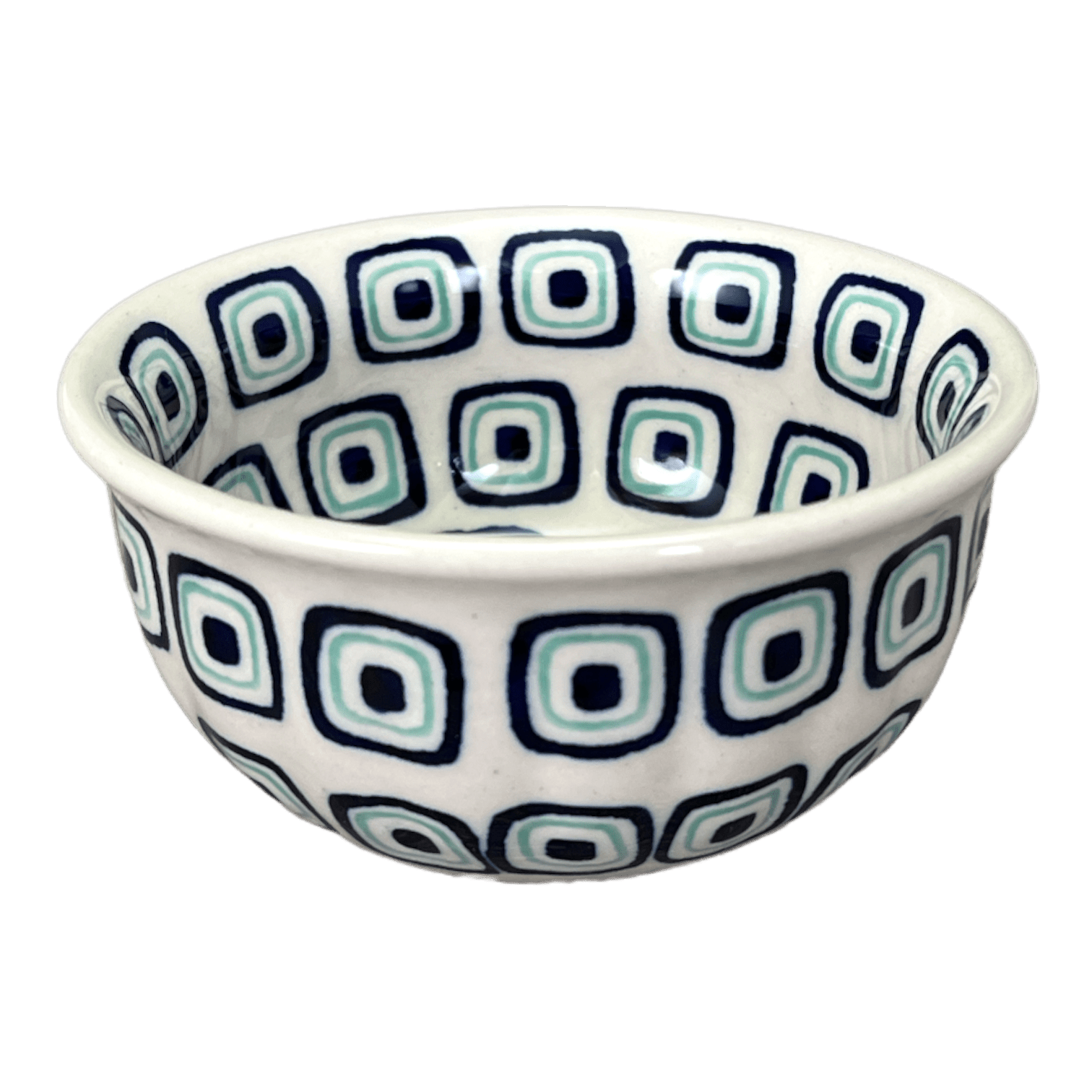 Introducing the vibrant and versatile Polish Pottery 4.5" Bowl by Manufaktura in the captivating "Green Retro" pattern (604A). This delightful little bowl is not only perfect for serving dips and condiments, but it also adds a pop of color and style to any table setting. With its geometric design elements in a predominantly green hue, accented with touches of white and blue, this bowl is a true visual delight.