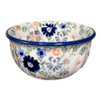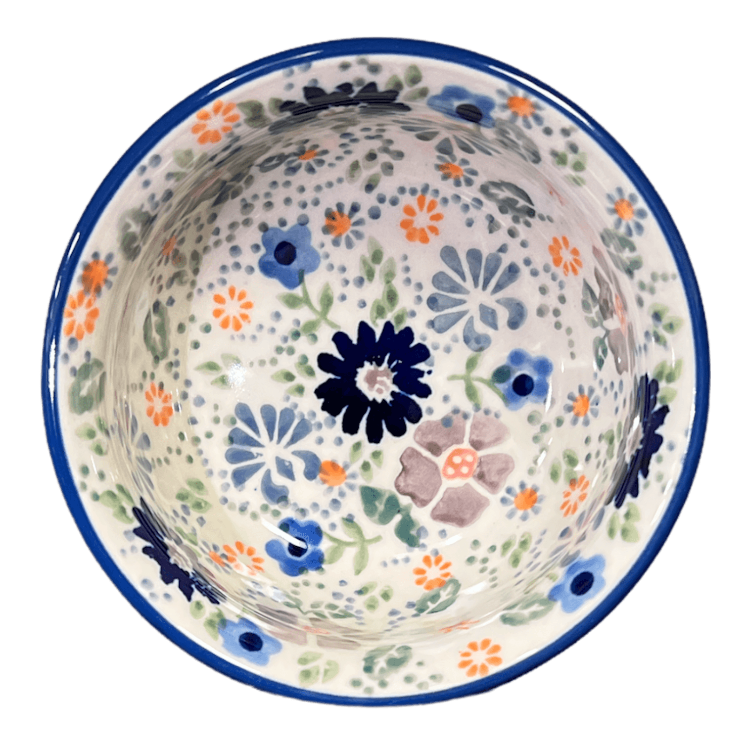 Immerse yourself in the enchanting world of Polish pottery with this exquisite 4.5" bowl from Manufaktura, crafted in the heart of Boleslawiec, Poland. Known for its vibrant and intricate "Scattered Petals" pattern, this bowl is a canvas of creativity featuring large dark blue and gray blooms, complemented by delicate light blue flowers and lush green leaves, all set against a crisp white background. Whether you're serving up your famous salsa or a simple side of olives, this bowl transforms every dip and condiment into a centerpiece of conversation.
