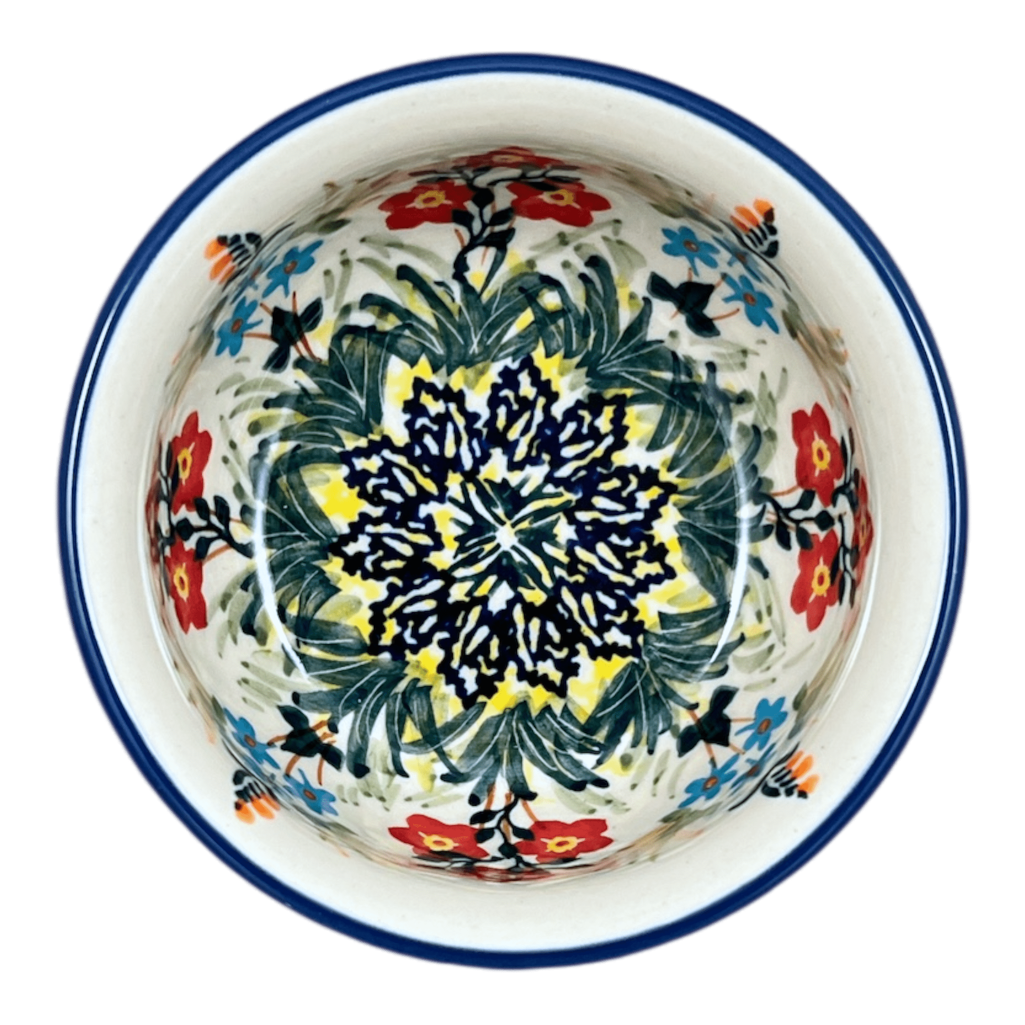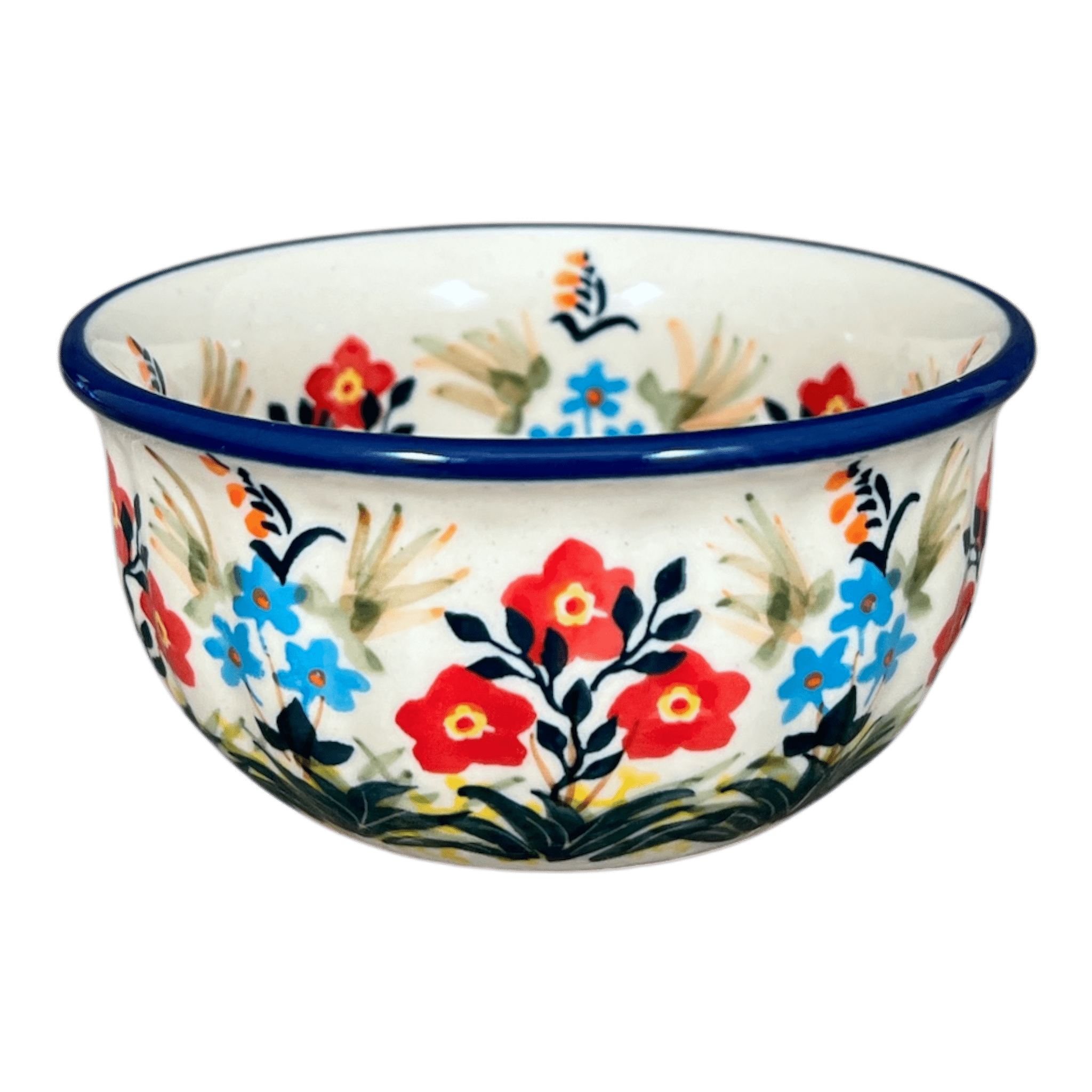 Imagine a dash of enchantment on your dining table with the exquisite Polish Pottery Bowl from Manufaktura, adorned in the mesmerizing "Bundled Bouquets" pattern. This delightful 4.5" round bowl, perfect for dips or condiments, brings the charm of a blossoming garden right into your home. The vibrant design showcases a captivating dance of red, green, blue, and white hues. Picture the backdrop of a pristine white canvas, encircled by a symphony of yellow, green, and blue bands, while detailed clusters of red and light blue flowers play a visual melody around the center. This piece isn't just a bowl; it's a portal to a spring meadow, waiting to add a splash of color and joy to your every meal.