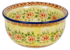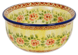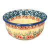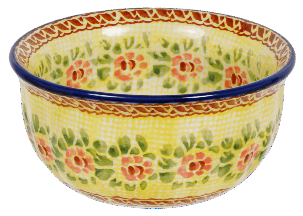 Immerse yourself in the charming allure of the Polish Pottery Bowl from Manufaktura, a true gem adorned with the vibrant "Bountiful Blossoms" pattern. This delightful 4.5" round bowl, expertly handcrafted in the historic town of Boleslawiec, Poland, brings a splash of color and artistry to any setting. Whether you're serving up your favorite dips or dishing out condiments, this bowl is not just a vessel, but a conversation starter. The "Bountiful Blossoms" pattern features a lively dance of small light green flowers set against a dark green center, encircled by tightly overlapping pairs of radiant red flowers on a cheerful yellow background, each duo embraced by lush green leaves.