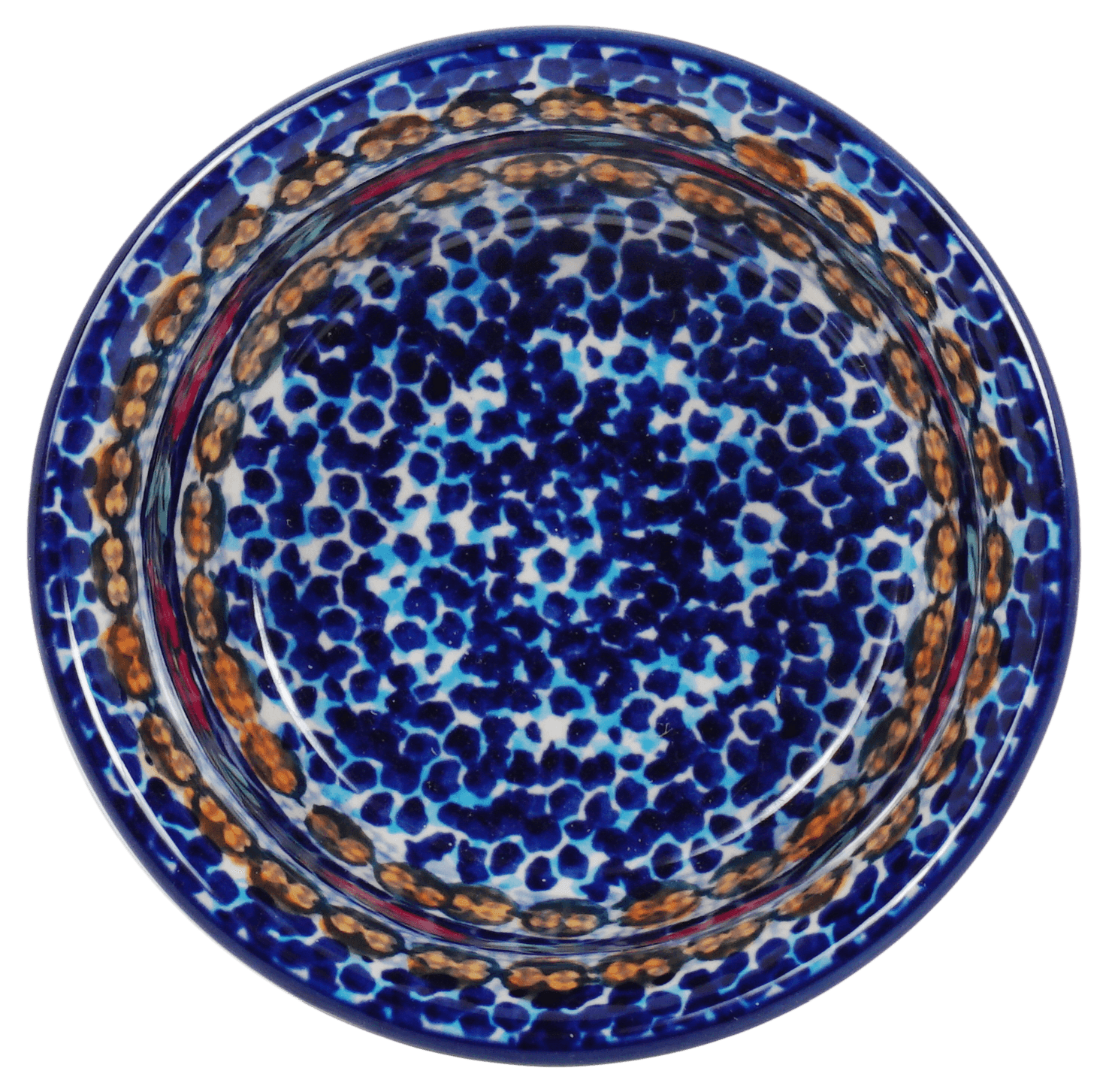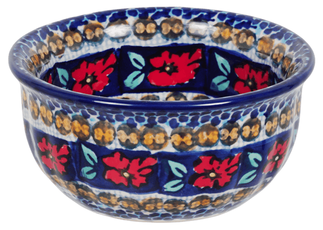 Introducing the enchanting Manufaktura Polish Pottery Bowl in the mesmerizing "Crimson Twilight" pattern (WK63). This delightful 4.5-inch bowl, perfect for serving dips or condiments, will steal the spotlight at any gathering. The "Crimson Twilight" design is a masterful symphony of color, featuring a light blue backdrop adorned with dense blue dots at its heart. Around the edges, vibrant red flowers dance with pairs of small green leaves against a dark blue canvas. This pattern isn’t just a design; it's a celebration of artistry, where every detail tells a story of tradition and craftsmanship.