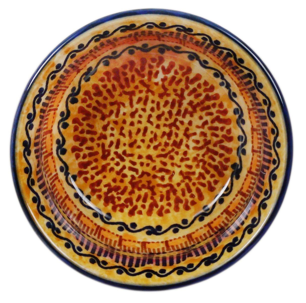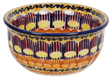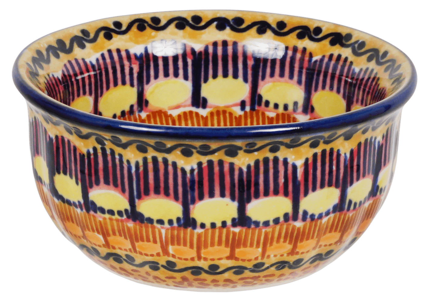 Imagine starting your day with a splash of vibrant colors and exquisite artistry right on your breakfast table. The Polish Pottery Bowl from Manufaktura, adorned in the captivating "Desert Sunrise" pattern, offers just that! This petite 4.5" bowl, perfect for holding your favorite dips or condiments, features a stunning design that captures the essence of a desert dawn. The pattern showcases a mesmerizing play of colors with a warm orange background and tiny, densely packed brown dots. Encircling this are bands of radiant suns painted in cheerful yellows with blue rays, and a smaller inner band of orange suns detailed with brown rays, bringing a piece of the sunrise to your table.