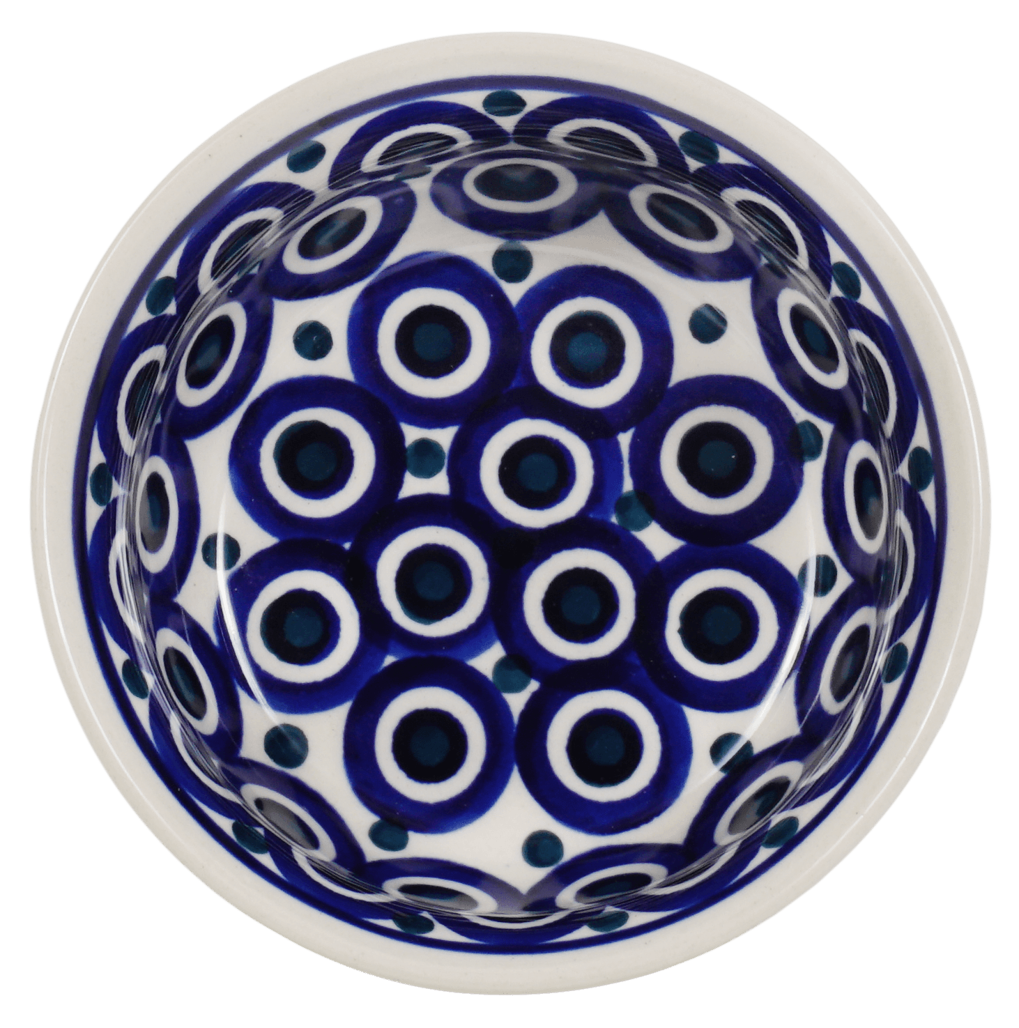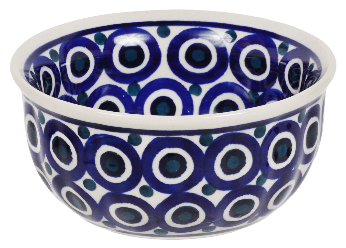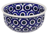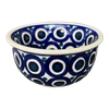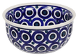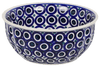 Introducing the Polish Pottery 4.5" Bowl by Manufaktura in the captivating "Eyes Wide Open" pattern! This little bowl is not only great for dips or condiments, but it is also a work of art that will add a touch of whimsy to your table. The pattern features design elements incorporating circles in a predominantly blue color with accents in white, creating a mesmerizing visual feast for the eyes.