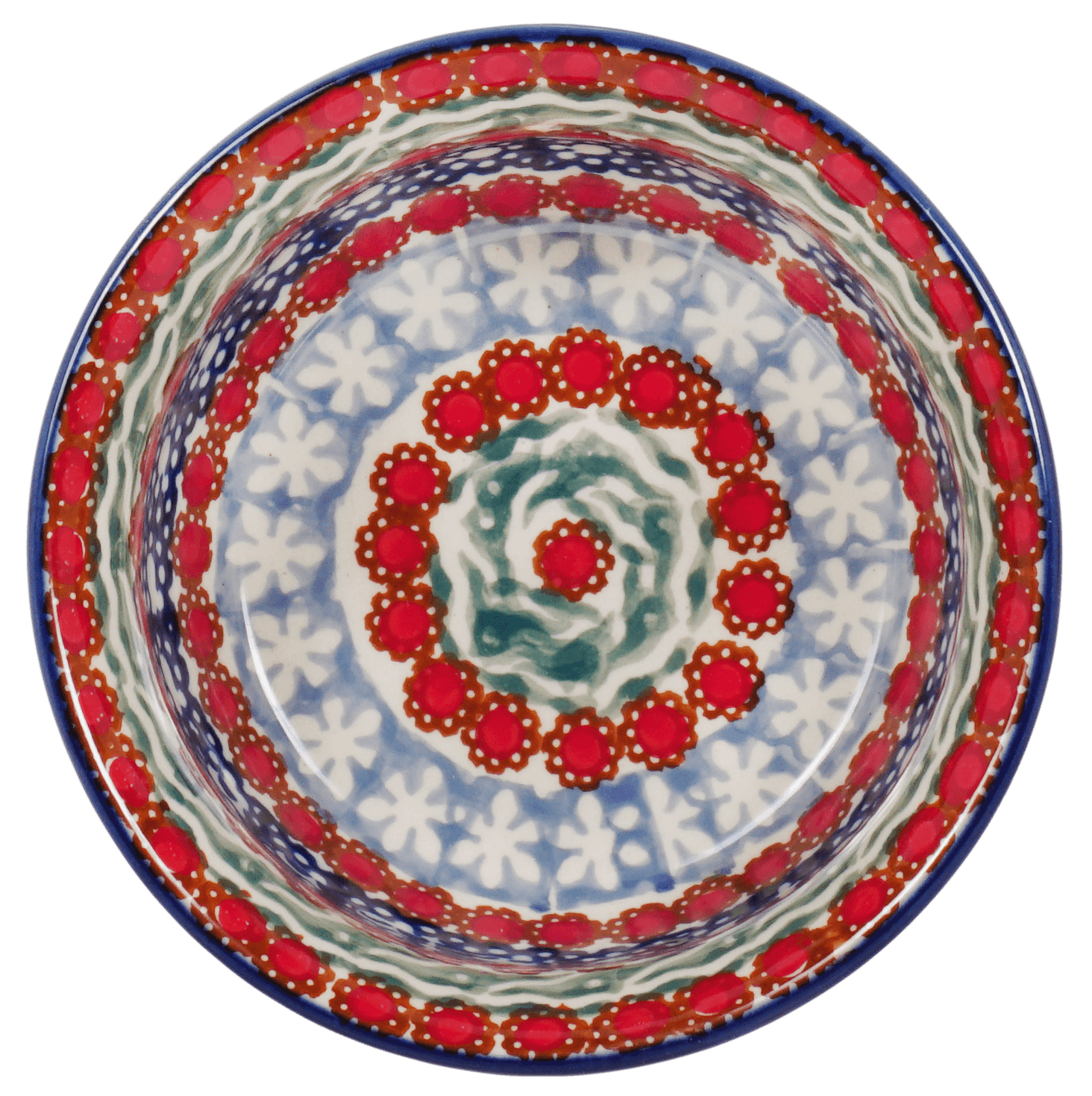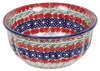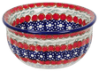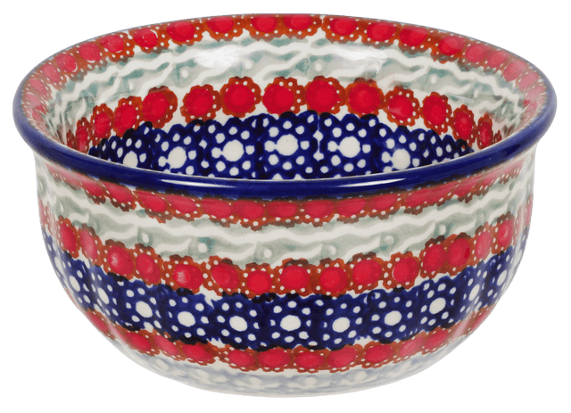 Dive into the vibrant world of Polish pottery with this charming 4.5" bowl from Manufaktura, featuring the stunning "Fanfare" pattern. Not just any ordinary bowl, this piece is a canvas of geometric beauty, painted with meticulous care in the bustling workshops of Boleslawiec, Poland. The "Fanfare" pattern is a symphony of colors—bold reds, soothing teals, and deep blues dance around a playful arrangement of simple floral designs. Perfect for holding dips or condiments, this bowl turns every meal into a festive occasion, inviting smiles and compliments from guests.
