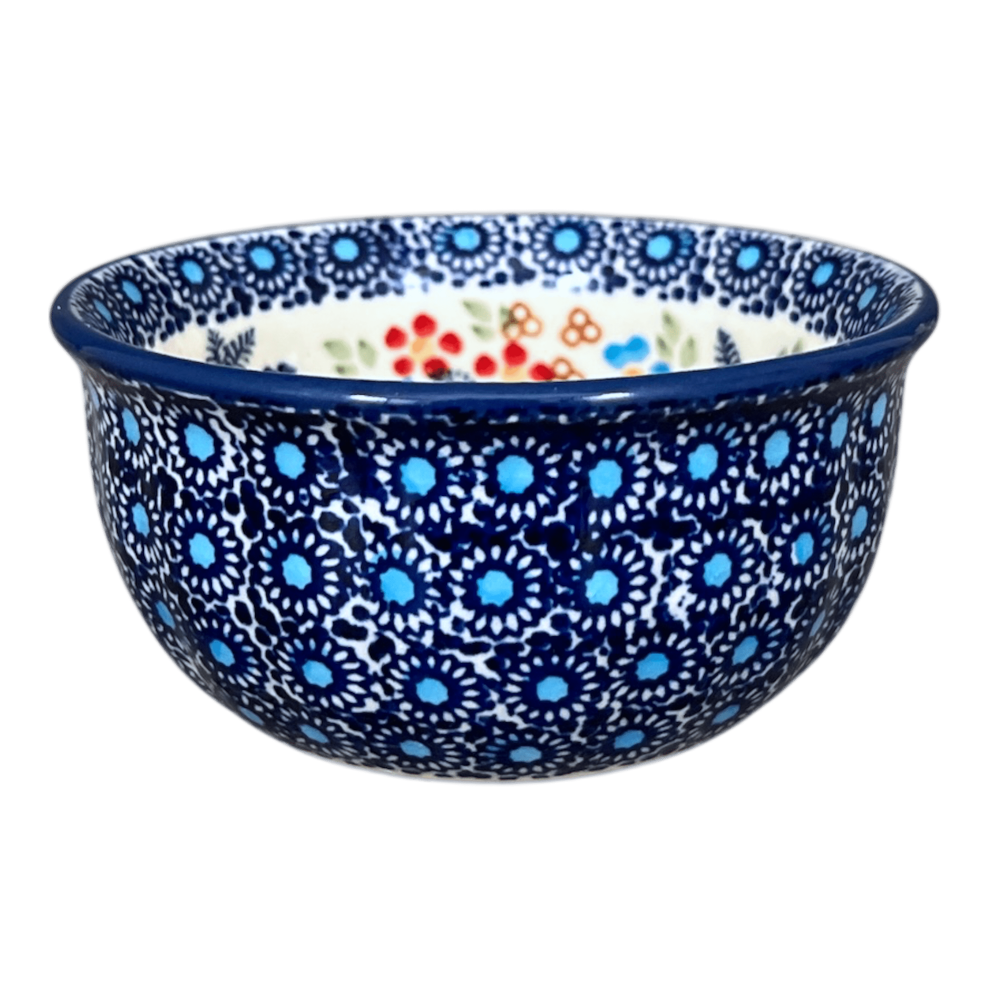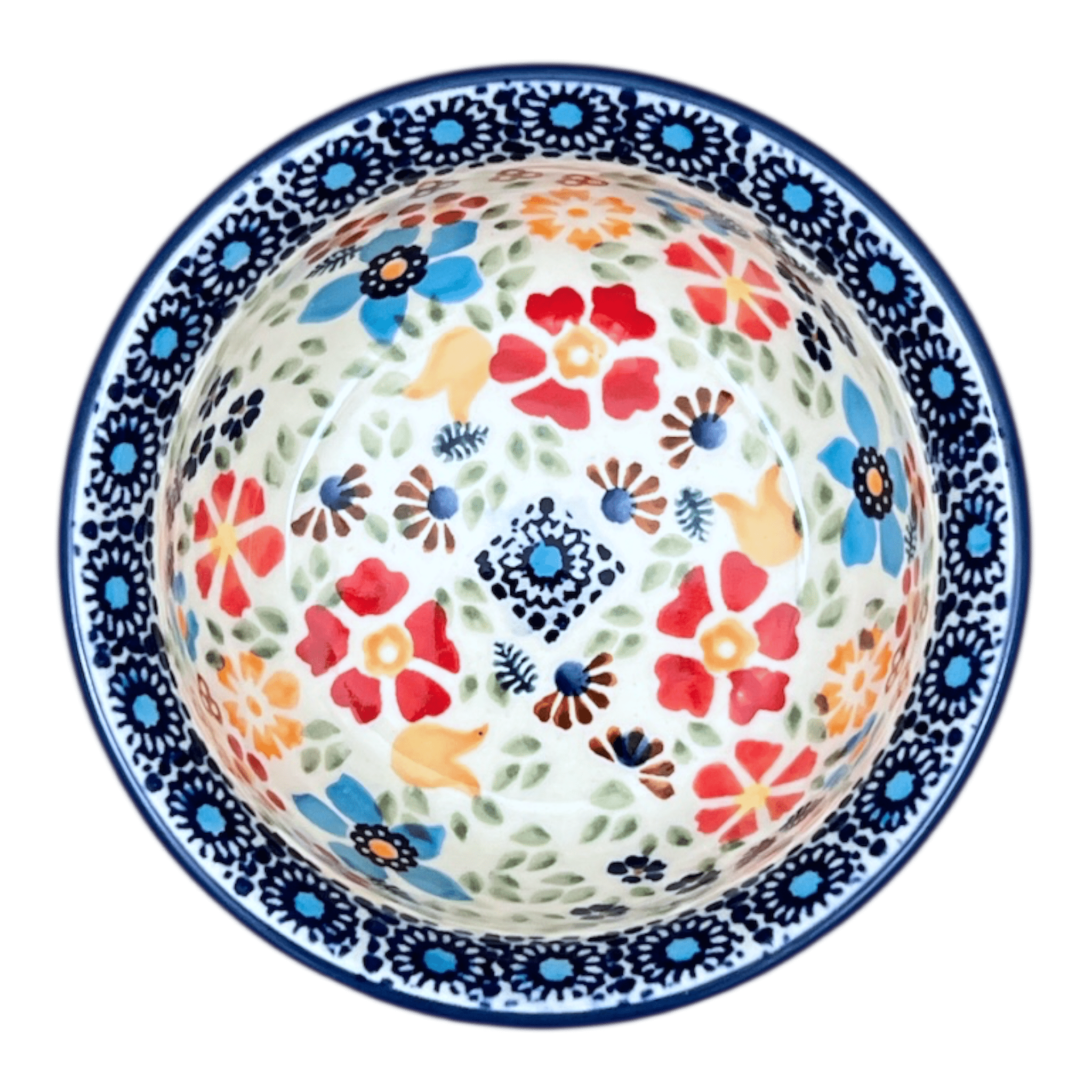 Introducing the enchanting Manufaktura 4.5" Polish Pottery Bowl, a small yet striking masterpiece crafted in the heart of Boleslawiec, Poland. This delightful bowl, adorned with the vibrant "Festive Flowers" pattern, brings a splash of color and charm to any setting. The design features a crisp white background, highlighted by an array of flowers in red, blue, orange, and pink hues, complemented by tiny green leaves that fill the spaces in between. Whether used for serving dips, condiments, or simply as a decorative piece, this bowl is sure to captivate and impress.