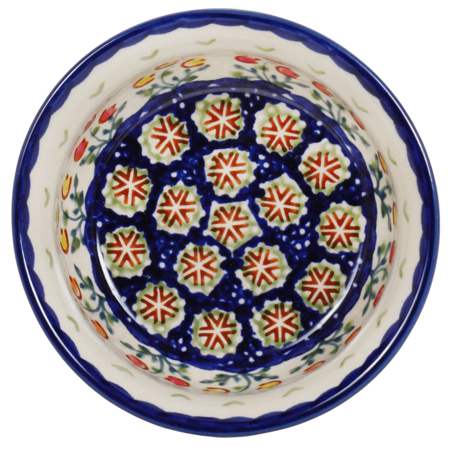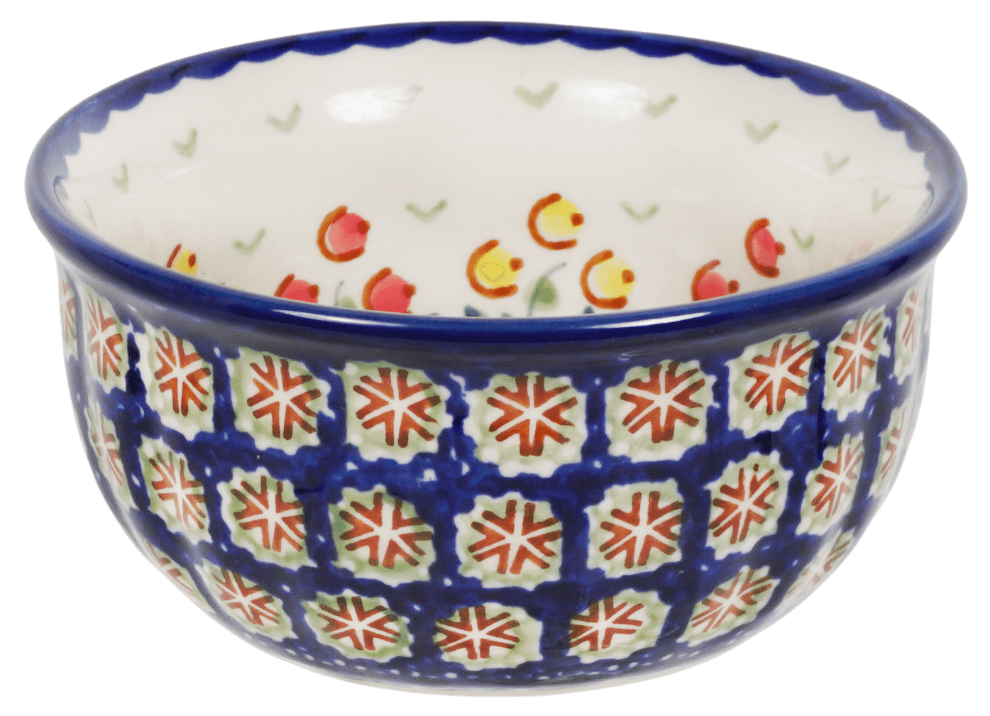 Introducing the enchanting Manufaktura 4.5" Polish Pottery Bowl, a true masterpiece from the heart of Boleslawiec, Poland. This exquisite bowl is not just any ordinary dish; it's a vibrant canvas painted with the mesmerizing "Floral Spray" pattern. Imagine a dance of vivid blues, sunny yellows, and fiery oranges, all brought to life with delicate white asterisks highlighted by red and green contours. The center of the bowl captures a blue backdrop, surrounded by a cheerful ring of petite red, orange, and yellow flowers cradled by teal green stems. It's a festival of colors and designs that promises to turn every meal into a celebration.
