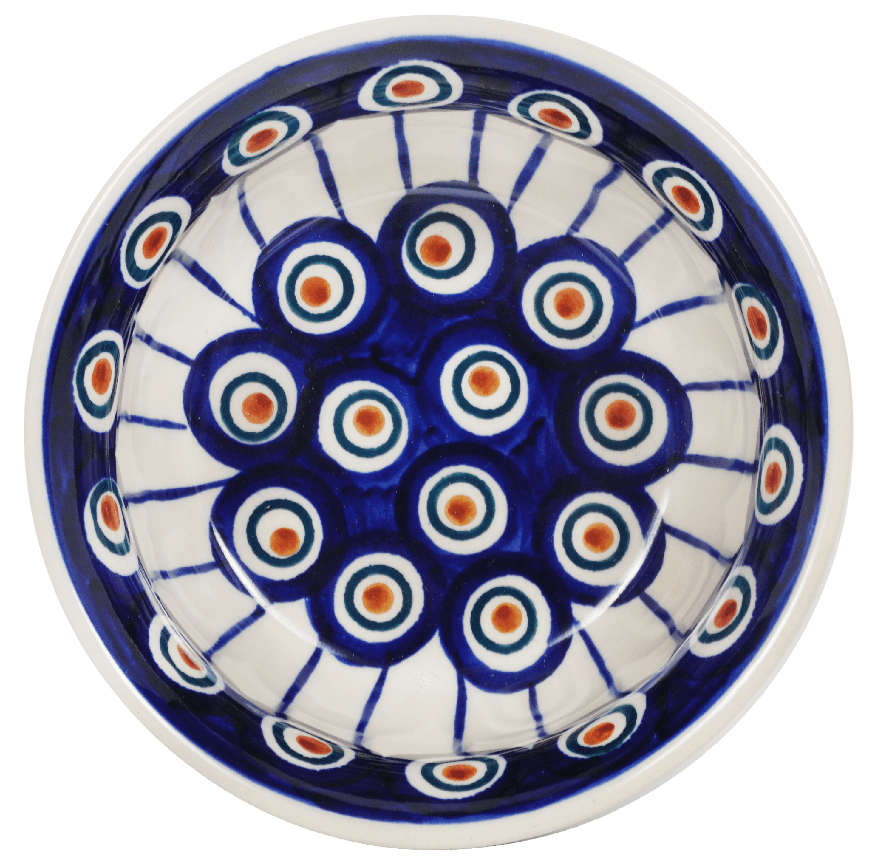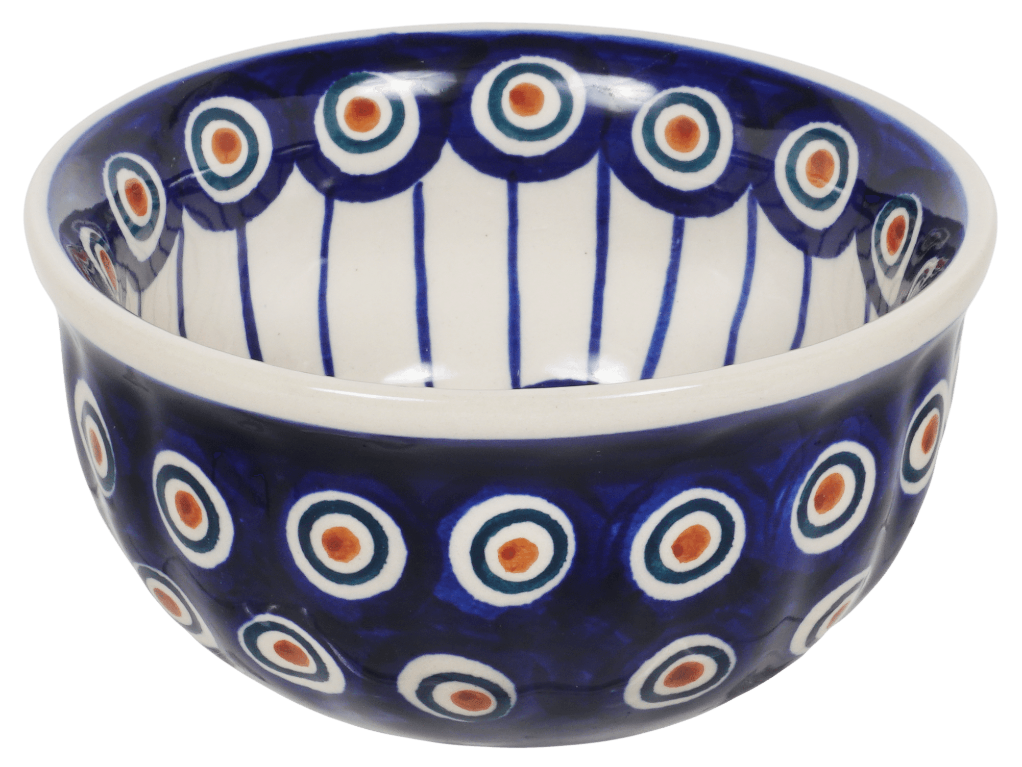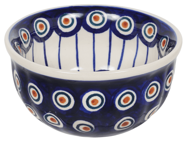 Introducing the Polish Pottery 4.5" Bowl by Manufaktura in the vibrant "Peacock in Line" pattern (54A). This bowl is not only functional but also adds a pop of color to your table! Perfect for serving dips or condiments, it's a must-have for any kitchen.