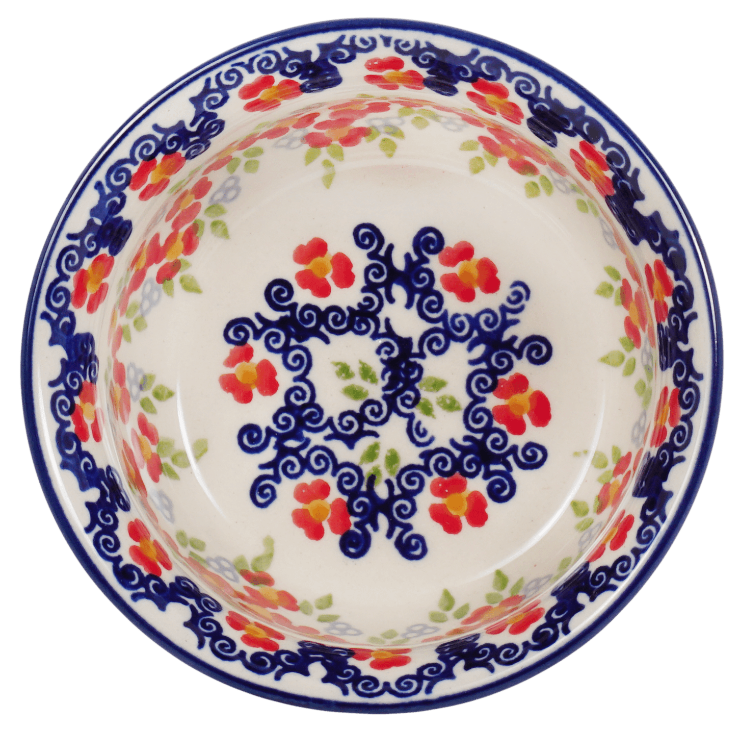 Imagine a delightful splash of color on your dining table with the enchanting "Ring Around the Rosie" Polish Pottery Bowl by Manufaktura. This petite 4.5" bowl, intricately designed and meticulously hand-painted in Boleslawiec, Poland, is not just a dish but a piece of art. The vibrant red flowers, accented with playful blue swirls and tiny green tufts of grass, dance around a pristine white background, evoking the joy and spontaneity of the beloved nursery rhyme. Perfect for serving dips, condiments, or even holding your precious trinkets, this bowl is a versatile gem that brings Polish tradition and craftsmanship right into your home.