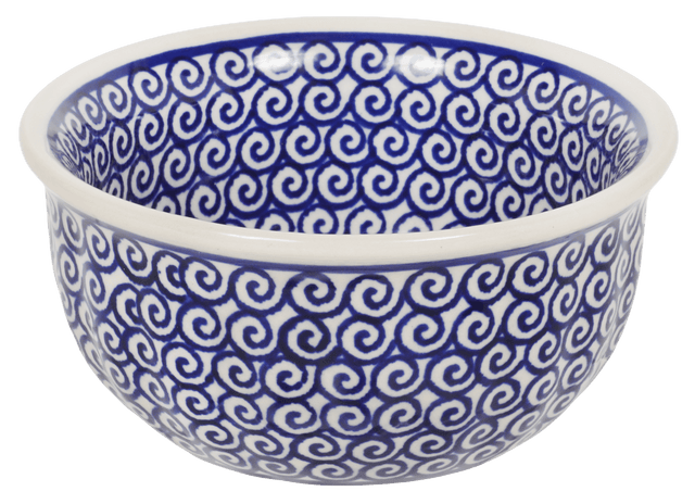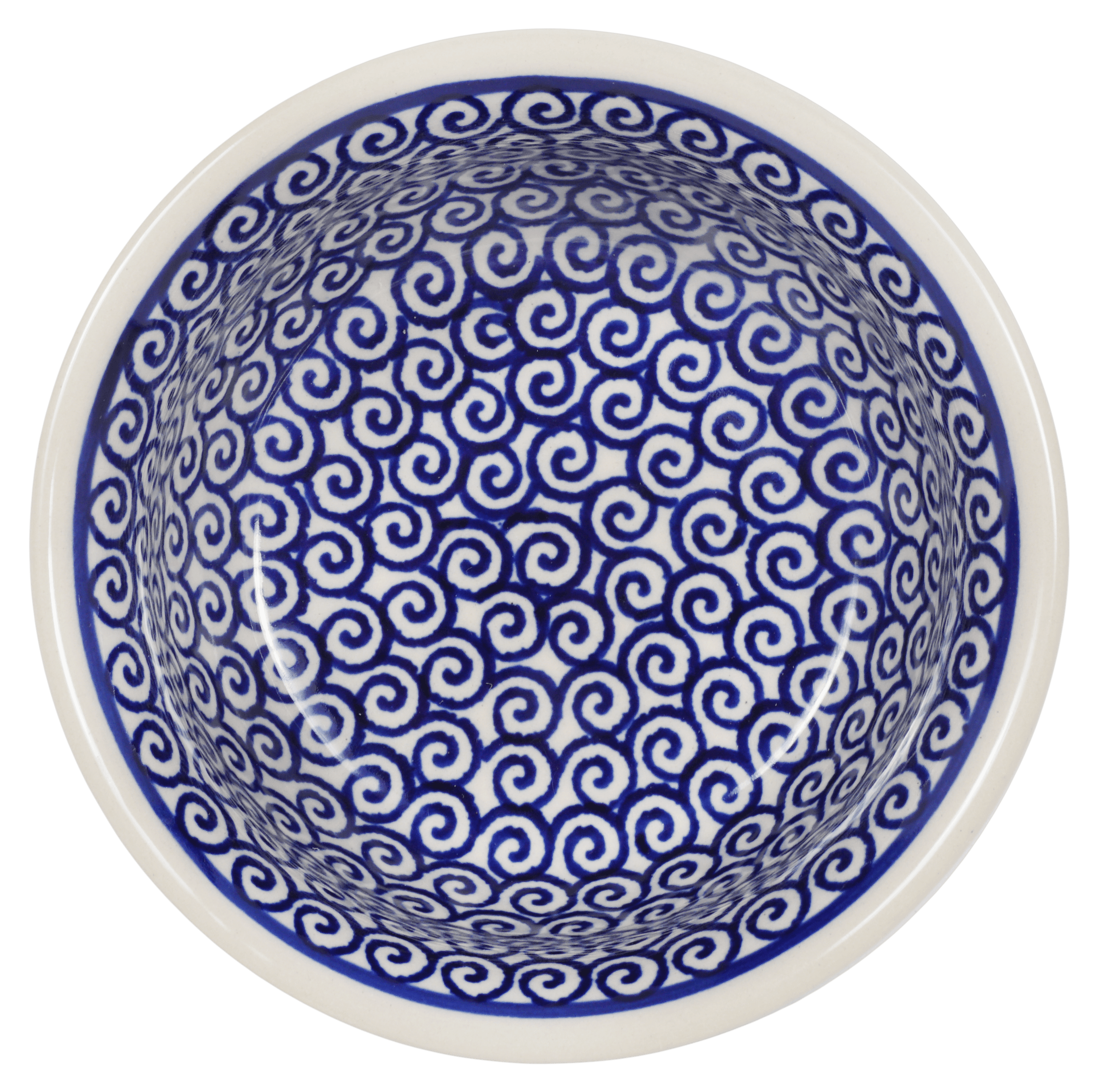 Introducing the Polish Pottery 4.5" Bowl by Manufaktura in the captivating "Riptide" pattern (63). This small but mighty bowl is not only great for dips or condiments, but it also adds a splash of fun and color to your table! The "Riptide" pattern features a mesmerizing blend of swirls and geometric shapes, predominantly in a soothing blue color with delicate accents in white. It's like having a piece of art right in the palm of your hand!