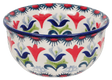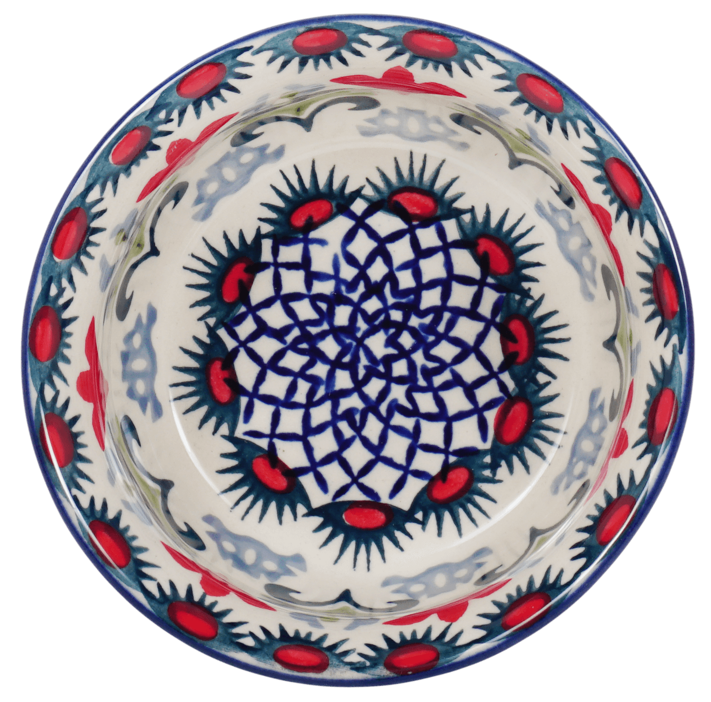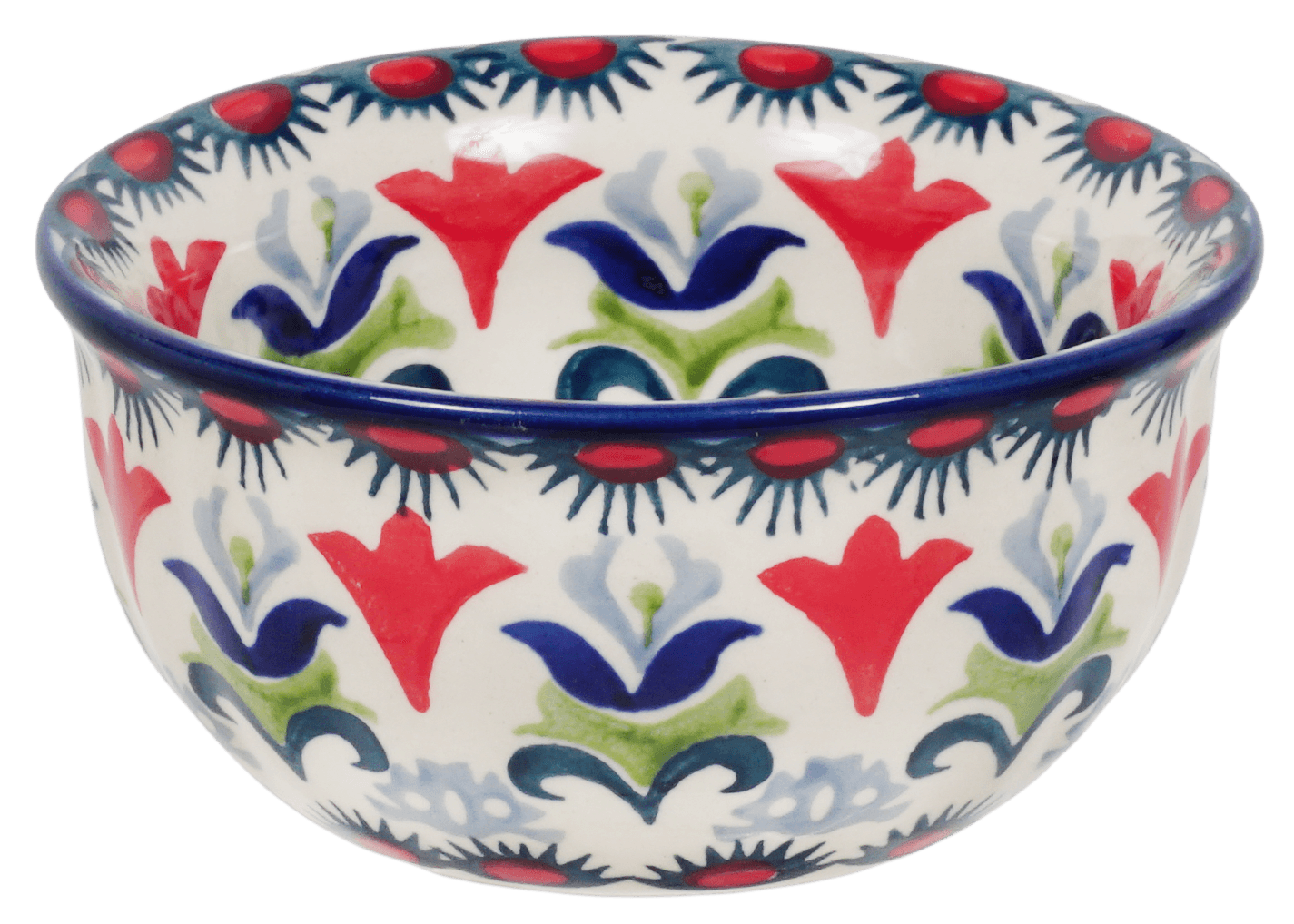 Imagine a splash of vibrant colors and intricate patterns that turn your dining experience into a festive celebration! Introducing the Polish Pottery Bowl from Manufaktura, a true masterpiece crafted in the heart of Boleslawiec, Poland. This charming 4.5" bowl, adorned in the "Scandinavian Scarlet" pattern, is not just a bowl, but a portal to a world of artistic elegance. The pattern boasts a dazzling white background intersected by a striking blue geometric weave, surrounded by a dance of bright red bellflowers and teal blue blossoms. This exquisite design is a testament to the unique Unikat level of artistry, reserved for pieces that feature an exceptional complexity and richness of color.