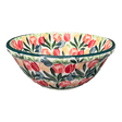 The "Tulip Burst" pattern is a delightful combination of flowers and geometric designs, predominantly in a refreshing green color, with accents in vibrant red, orange, and blue. Each bowl is meticulously made and hand-painted in Boleslawiec, Poland, by skilled artisans who take pride in their craftsmanship.