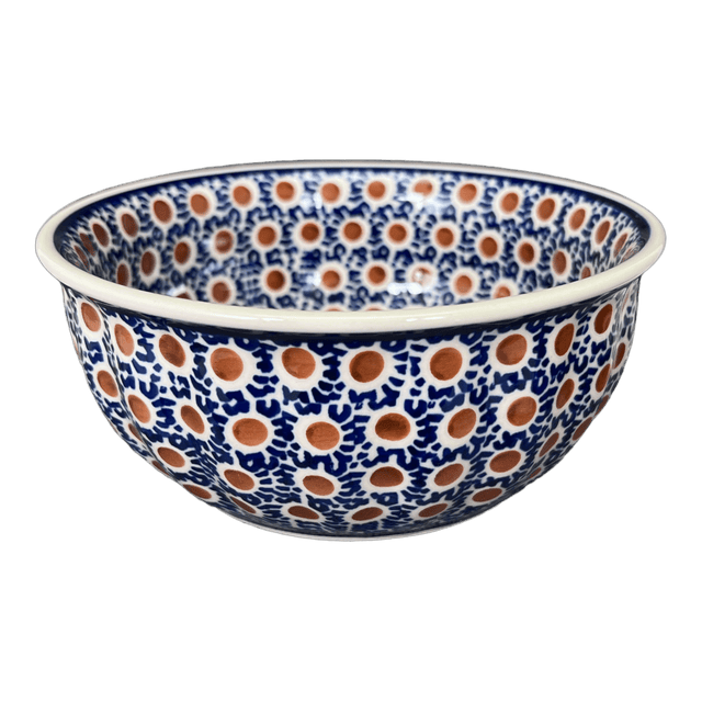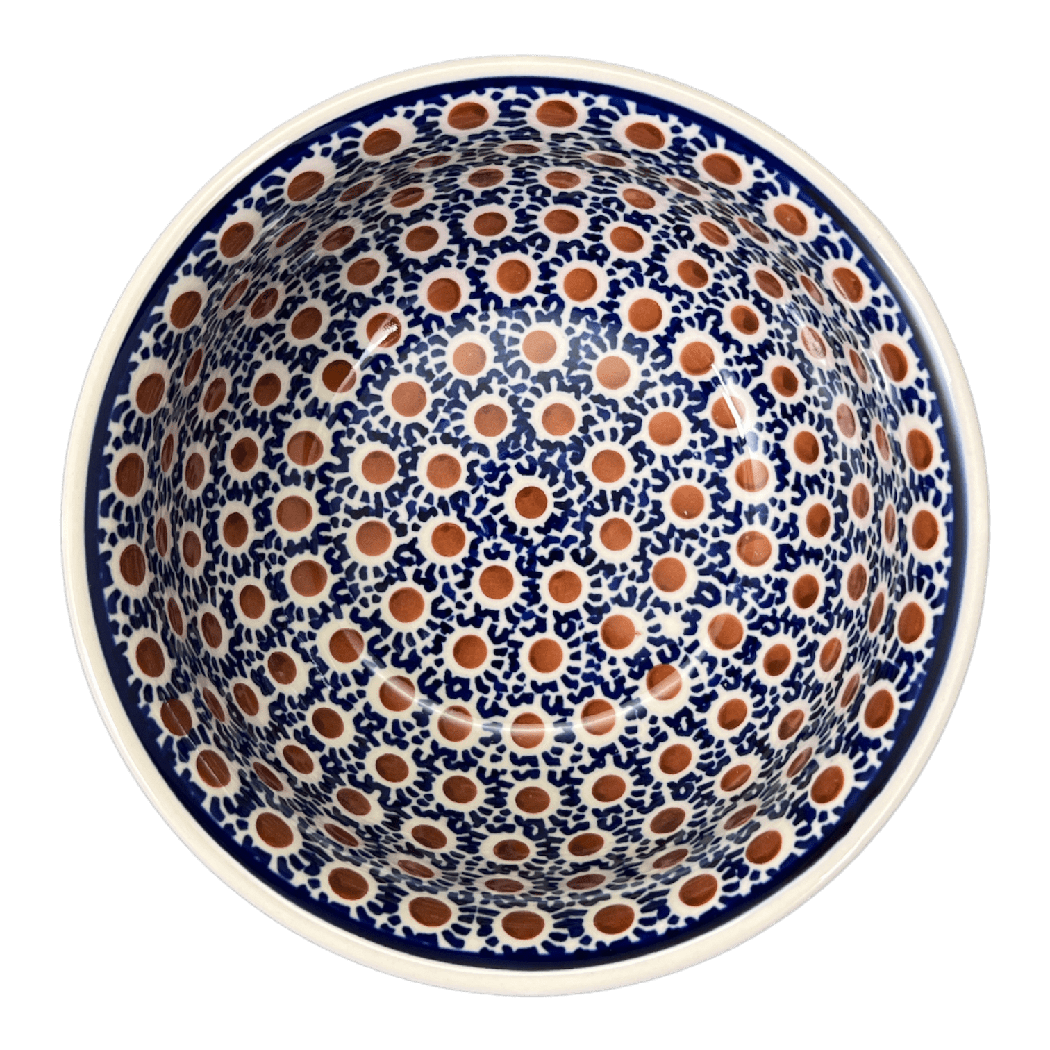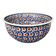 The "Chocolate Drop" pattern of this bowl is a true feast for the eyes. Featuring a mesmerizing combination of geometric shapes in a predominantly blue color, with accents in brown and white, it adds a touch of elegance to any table setting. Handcrafted and hand-painted in Boleslawiec, Poland by skilled artisans, this bowl showcases the rich cultural heritage of Polish pottery.