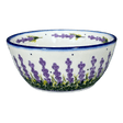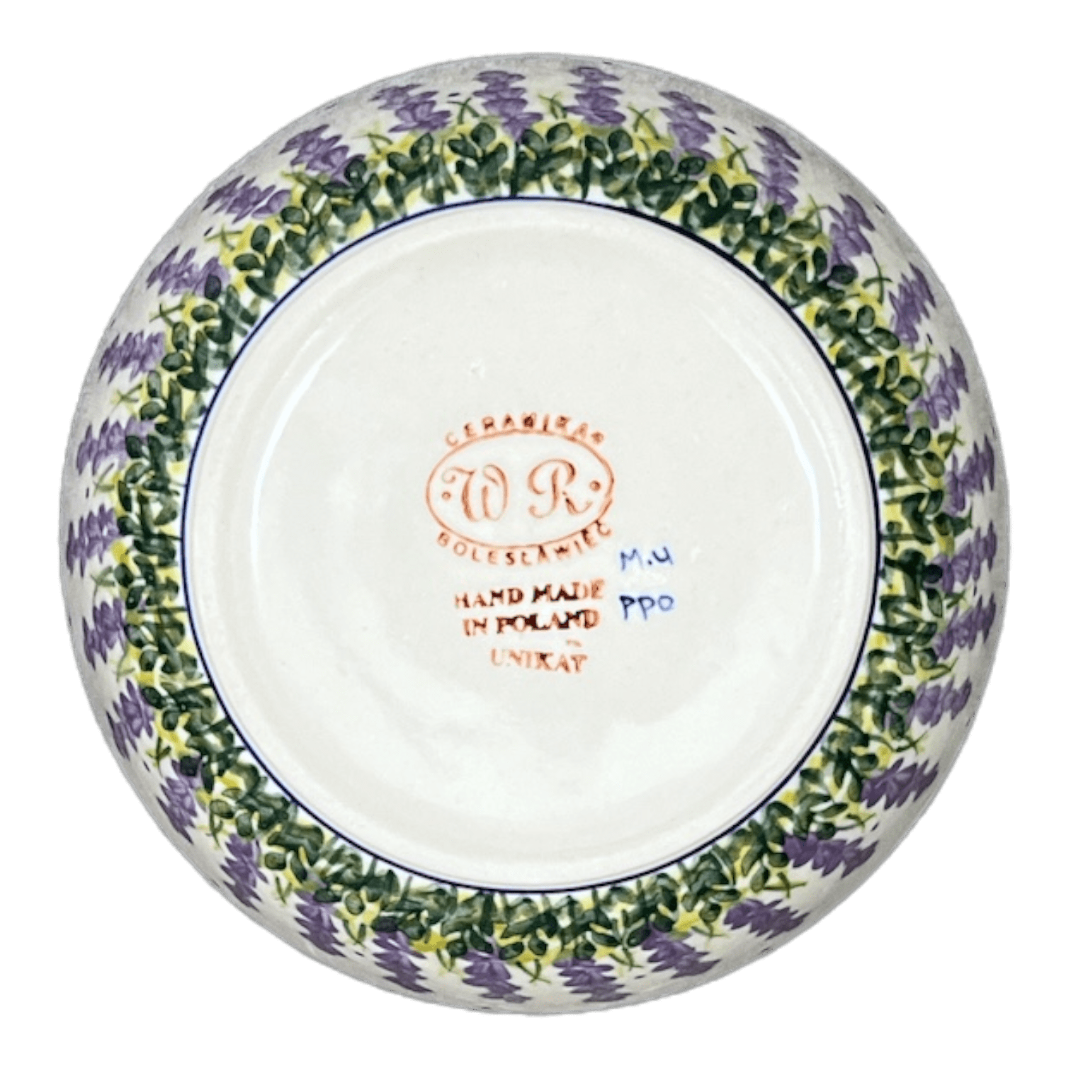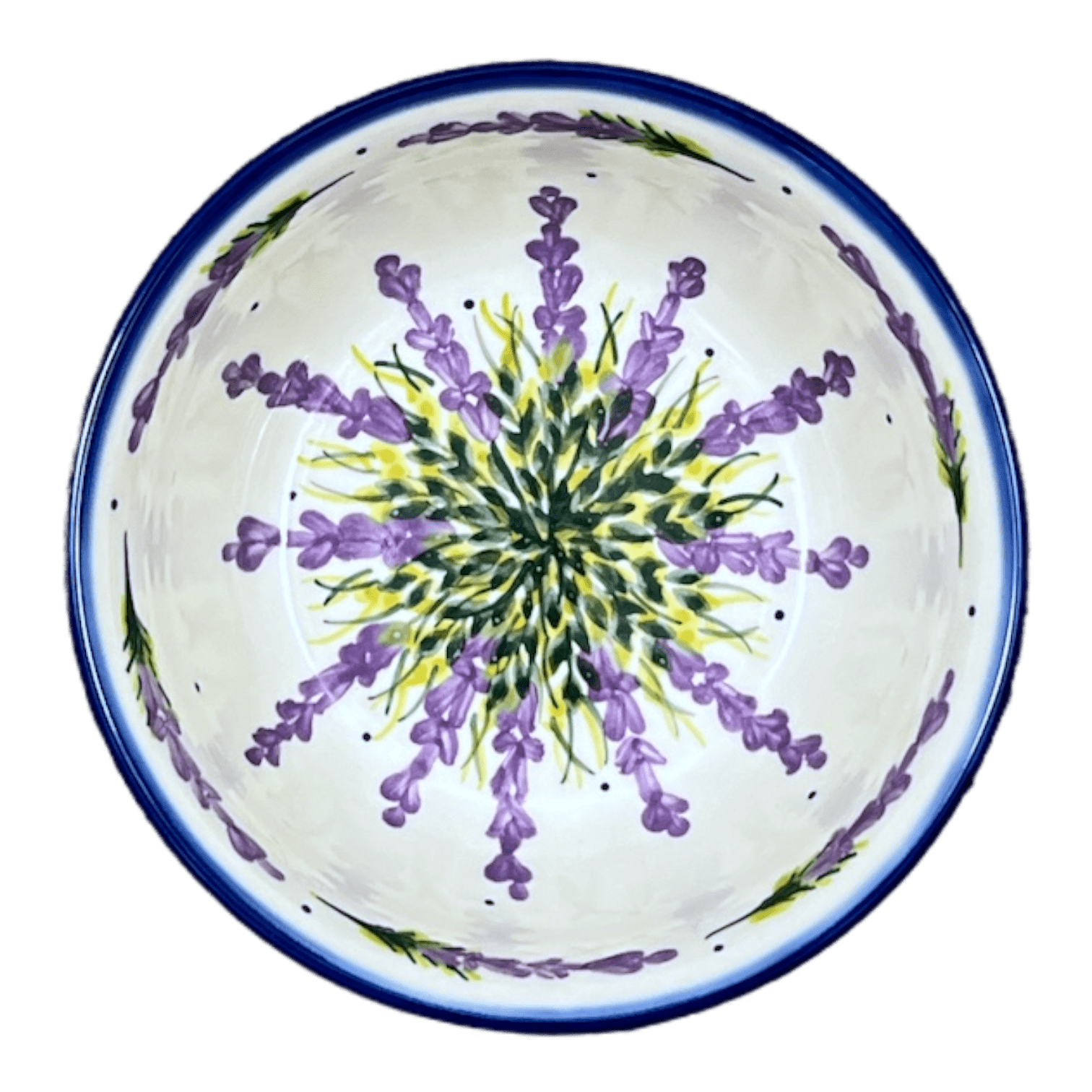 Immerse yourself in the charm of the Polish countryside with the enchanting "Lavender Fields" pattern on this exquisite 7-inch bowl from W.R. Ceramika. Picture yourself in a serene field of lavender, the air tinged with its sweet fragrance, as this bowl brings a piece of that pastoral elegance right to your dining table. Crafted by skilled artisans in the quaint town of Boleslawiec, Poland, each bowl is a canvas showcasing vibrant purple flowers and delicate green roots at its heart, encircled by playful tiny blue dots on a pristine white background. This design not only captures the essence of a lavender field but also brings a burst of color and joy to any meal, whether you're serving a fresh salad, a hearty pasta, or a comforting rice dish.