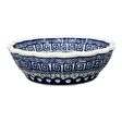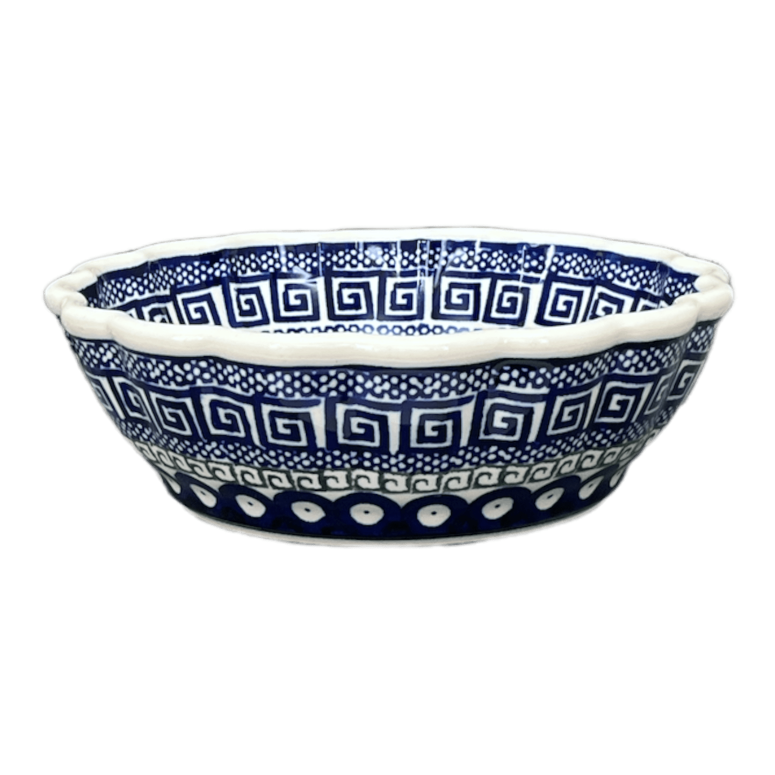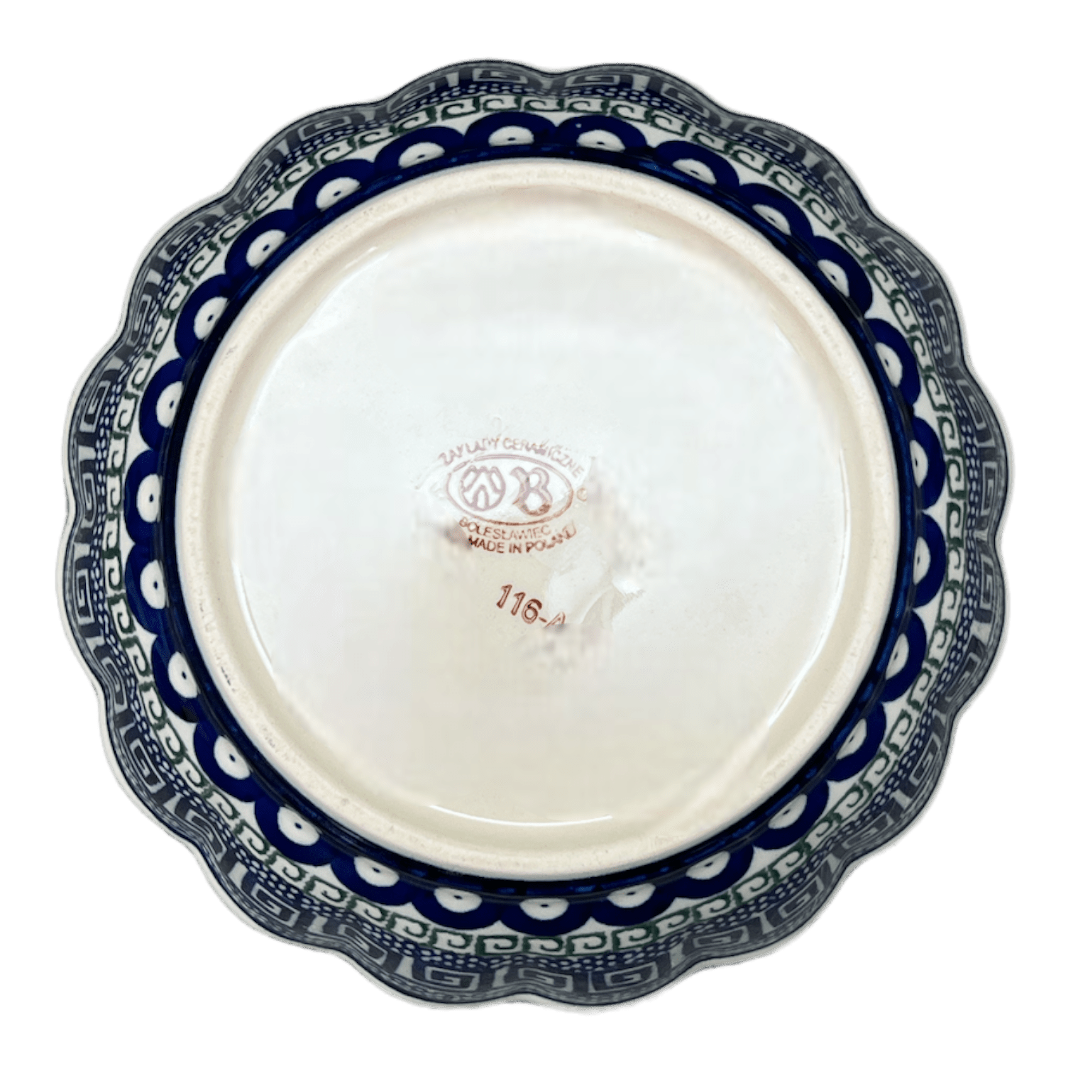 Imagine a dinner table graced with the charming allure of the Zaklady Polish Pottery Bowl, an exquisite piece that not only serves your favorite dishes but also serves as a centerpiece of conversation. This 7" scalloped round bowl, adorned with the captivating "Grecian Dot" pattern, brings a touch of traditional elegance to any meal. The design features classic white dots elegantly dispersed across a rich blue background, bordered by Grecian square swirls in harmonious shades of blue and green. Crafted in the heart of Boleslawiec, Poland, this bowl is a testament to the timeless artistry that Polish pottery is renowned for.