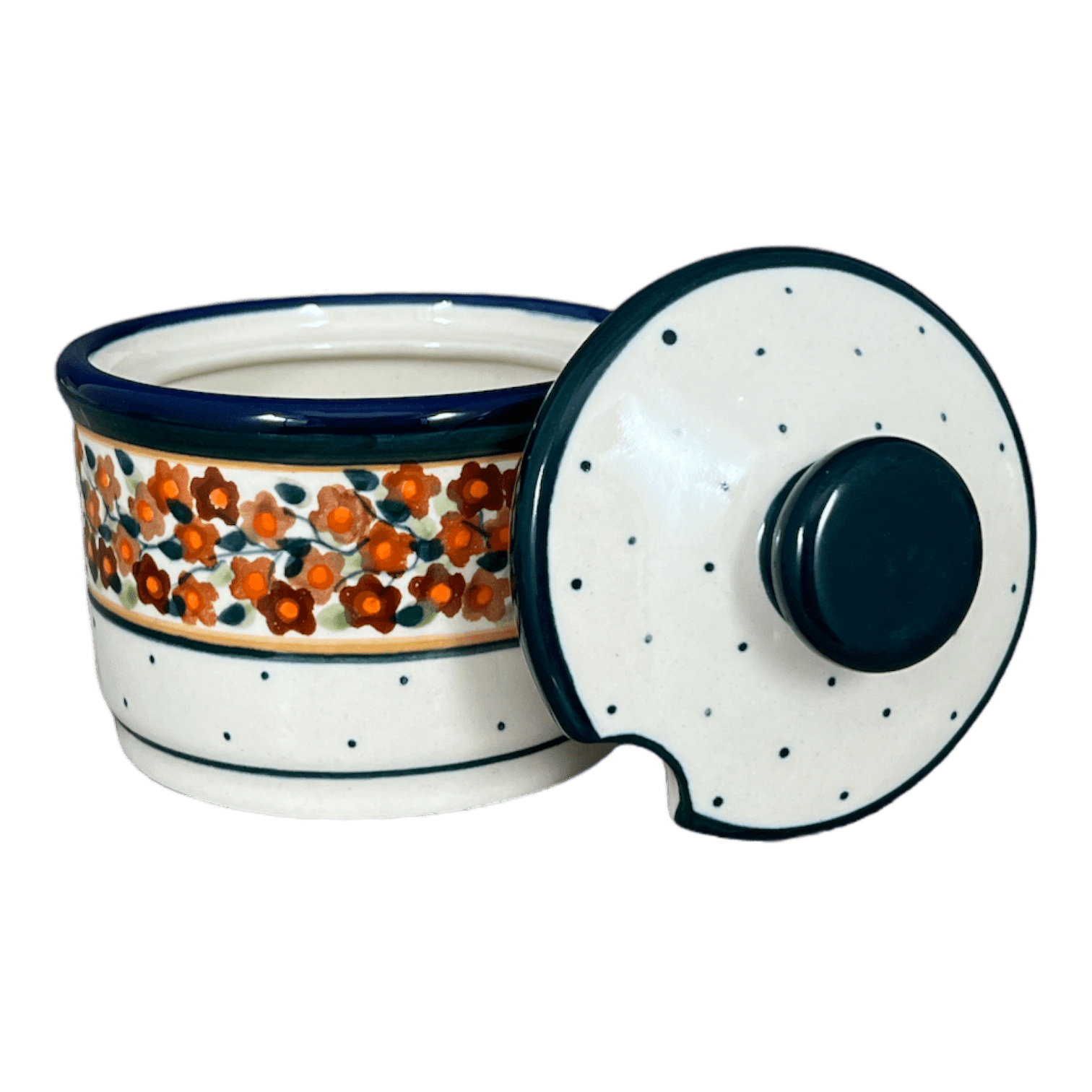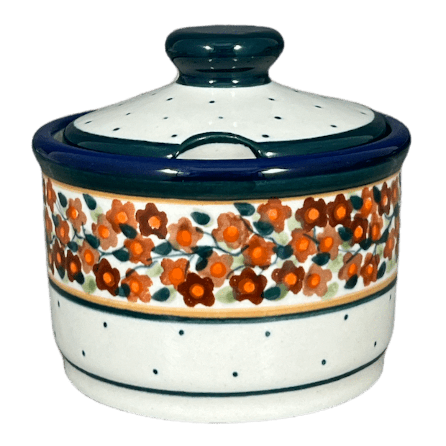 Imagine adding a dash of artistic charm and vibrant color to your table with the exquisite Polish Pottery Sugar Bowl from Zaklady. Crafted in the picturesque town of Boleslawiec, Poland, this delightful piece is more than just a container for sugar—it's a work of art. Featuring the "Orange Wreath" pattern, this bowl showcases a delightful ensemble of flowers in rich brown, accented with lively orange and green, all encircling a pristine white center speckled with tiny brown dots. It's not just any pattern; it's a Unikat pattern, which means "unique" in Polish. These designs require exceptional skill and creativity, making each piece a distinct work of art marked with a "UNIKAT" stamp of authenticity.