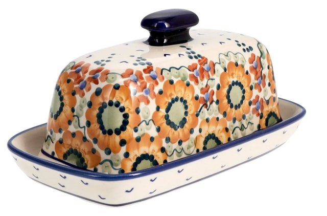 Introducing the Polish Pottery 7.5" x 4" American Butter Dish by Manufaktura in the mesmerizing "Autumn Harvest" pattern (LB). This butter dish is not your average kitchen accessory - it's an eye-catching home for your stick of butter or margarine! The "Autumn Harvest" pattern features a delightful blend of design elements, incorporating flowers in a predominantly gold color with accents in white and green.