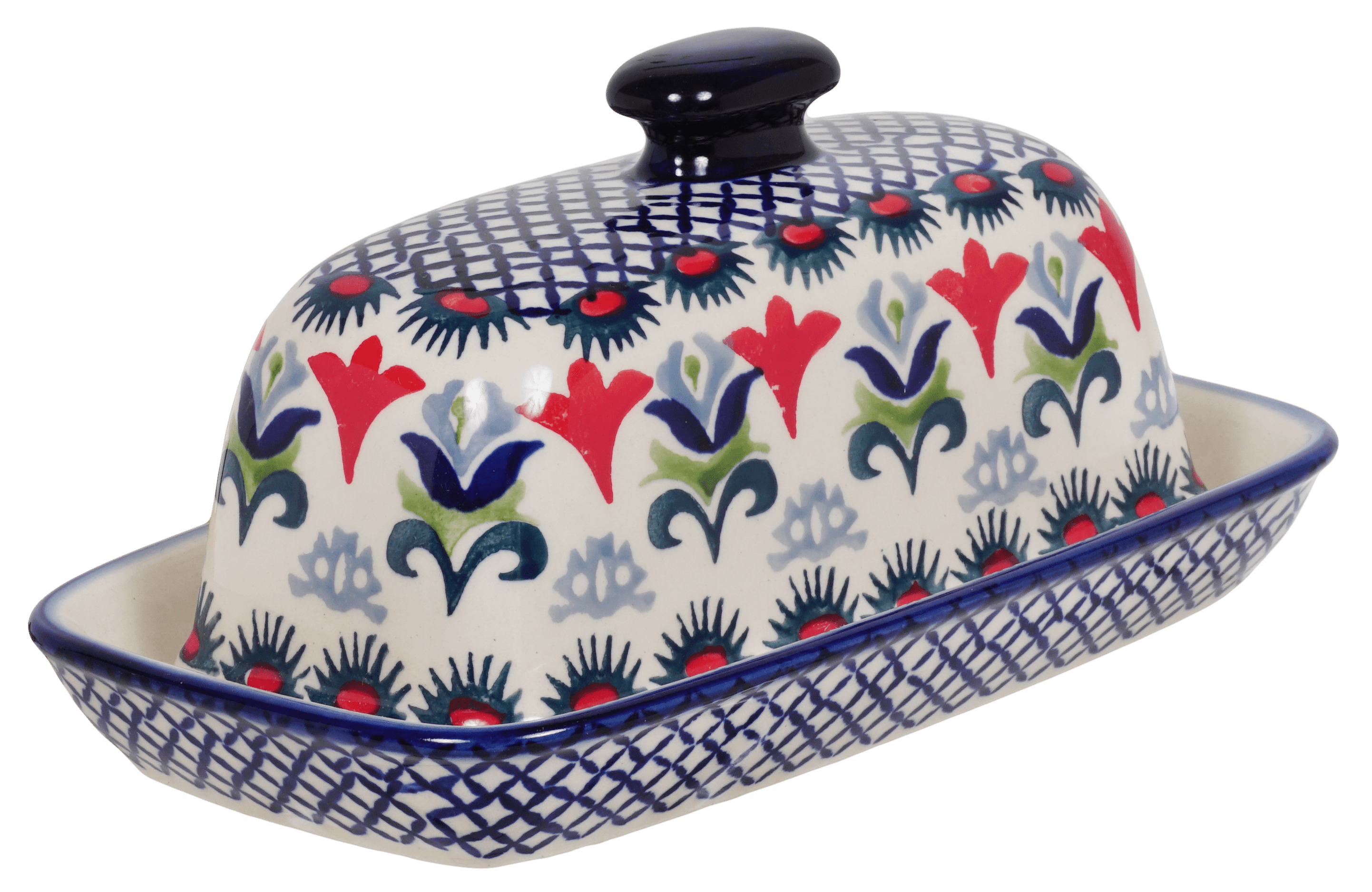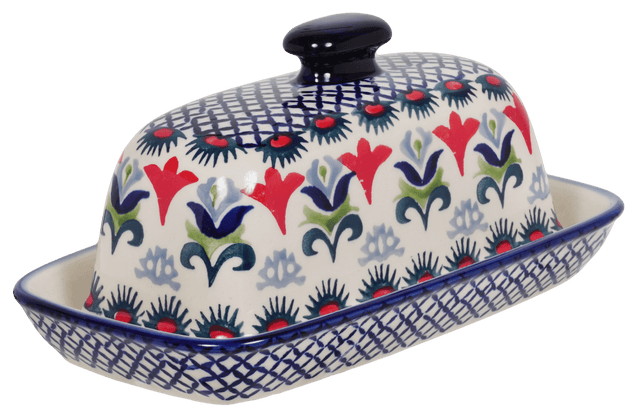 Introducing the Polish Pottery 7.5" x 4" American Butter Dish by Manufaktura in the captivating "Scandinavian Scarlet" pattern (P295). This butter dish is not just a functional kitchen accessory, but a true eye-catcher that will add a touch of elegance to your home. With its unique design elements incorporating Geometric and Weave patterns in a predominantly Blue color, accented with hints of Red and Green, this butter dish is a work of art.
