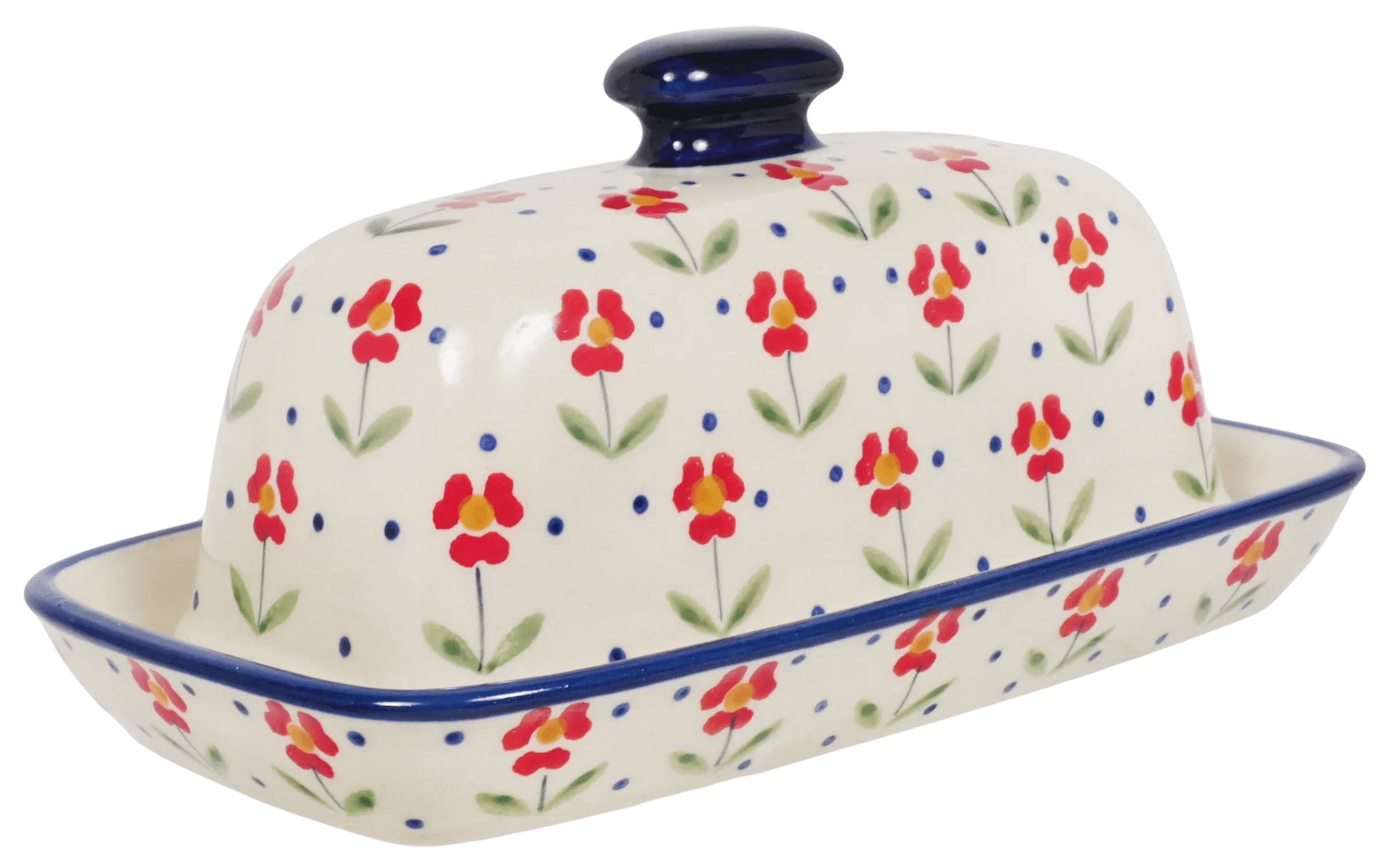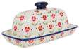 Imagine a dash of old-world charm right on your kitchen counter with the exquisite Polish Pottery Butter Dish from Manufaktura. Not just any ordinary butter dish, this piece, sized perfectly at 4" x 7.5", brings the vibrant allure of Boleslawiec, Poland into your home. Hand-painted by skilled artisans, the "Simply Beautiful" pattern features a delightful array of red flowers, intricately detailed with thin stems and small green petals, accented by playful tiny blue dots sprinkled across a crisp white background. This traditional design not only captivates the eye but also tells a story of artisanal heritage and love for nature.