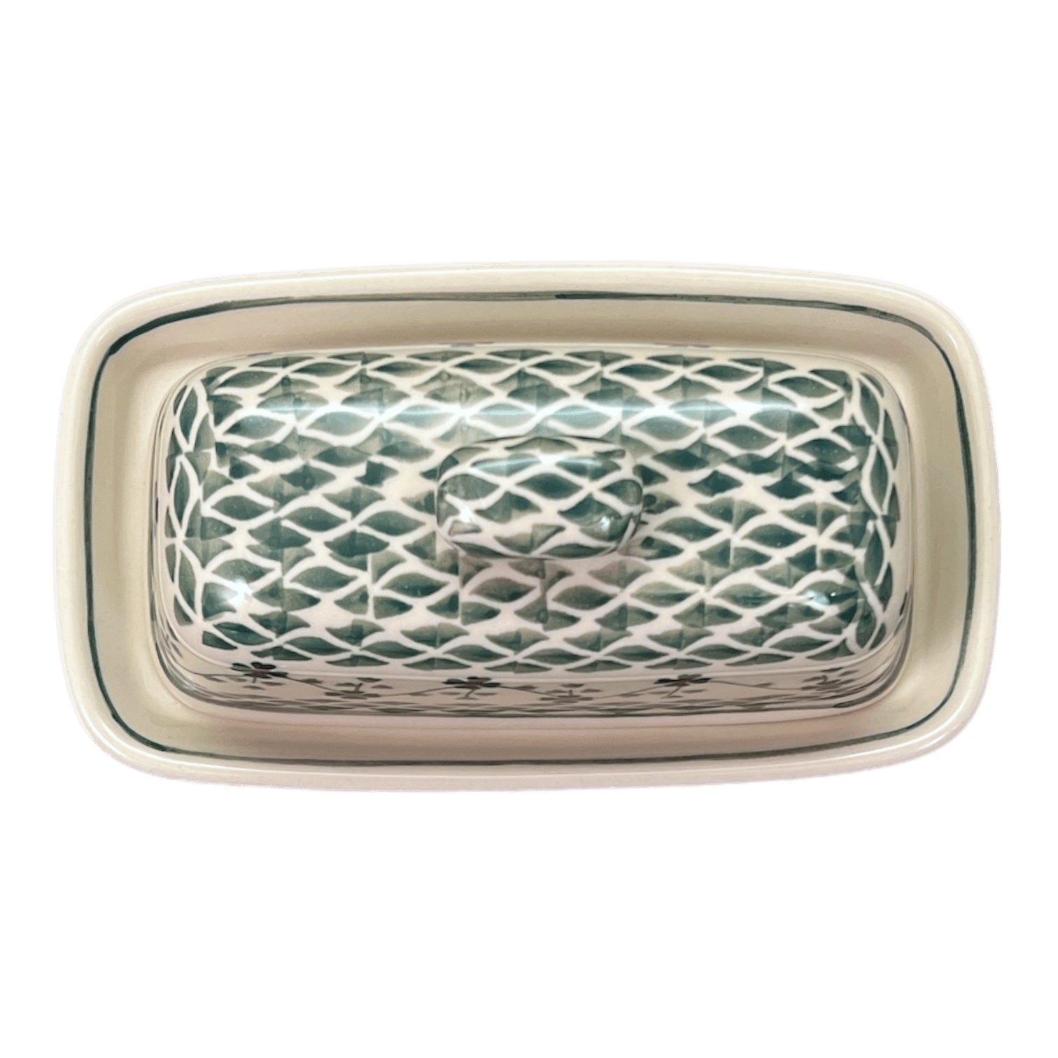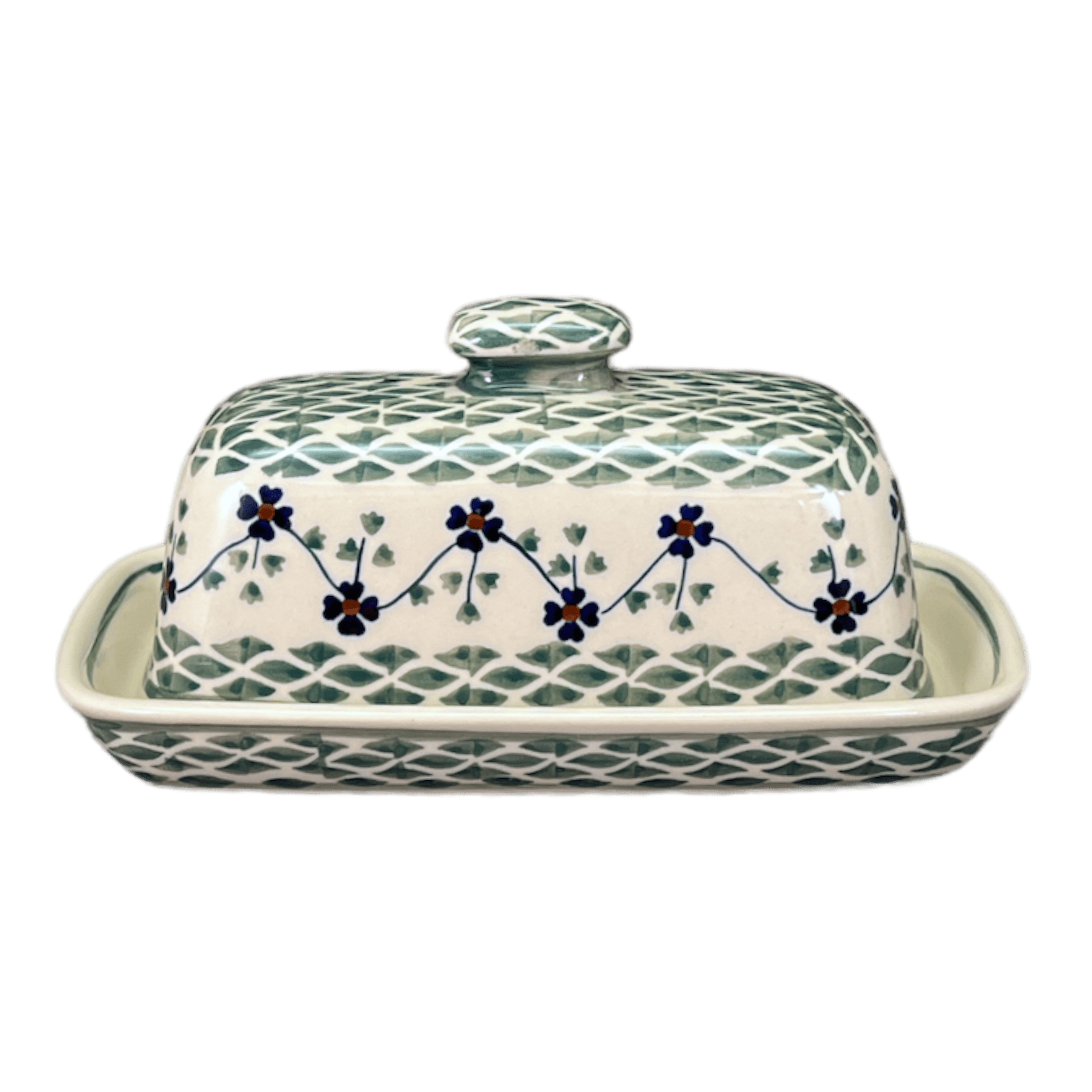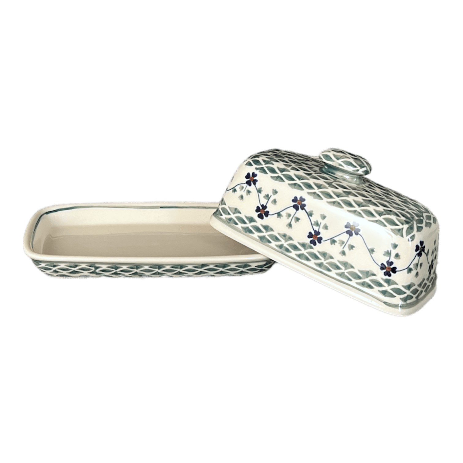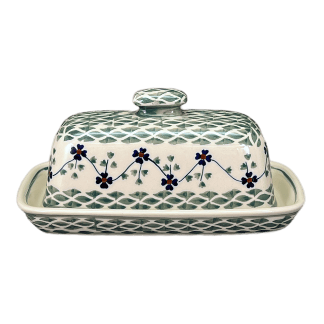 Imagine a delightful splash of color on your dining table with the enchanting Polish Pottery Butter Dish from Manufaktura, showcasing the traditional "Woven Pansies" pattern. This charming piece is not just a container but a small work of art, adorned with a vibrant pattern of flowers intertwined in predominantly green hues, with delicate white and blue accents. The white background highlights a green weave at the center, surrounded by a dainty band of simple blue and orange flowers linked by a slender green vine. Tiny trios of green leaves sprout from the flowers, adding a touch of whimsical charm to the design. This pattern represents a cherished level of traditional artistry, beloved for its familiarity and crafted using the age-old "punching" technique by highly skilled artisans.