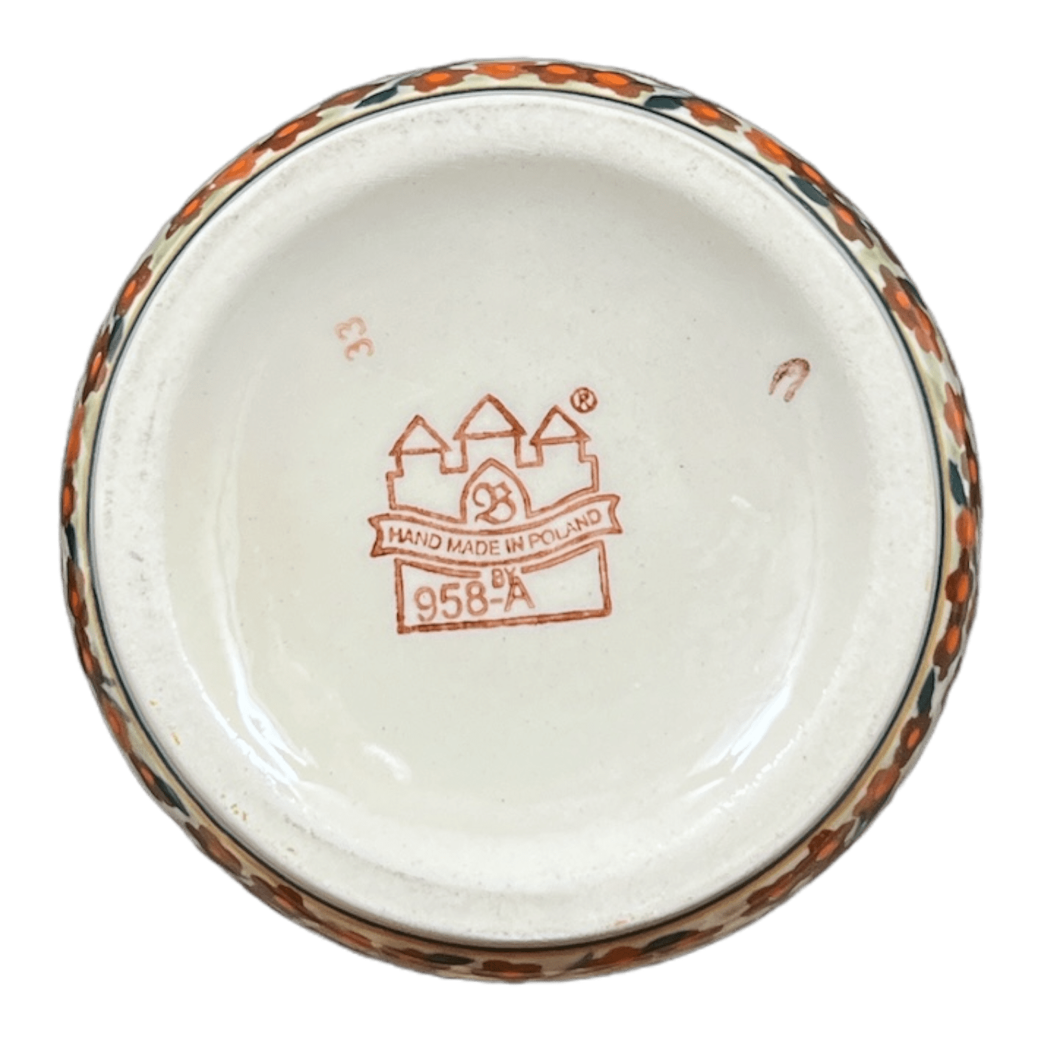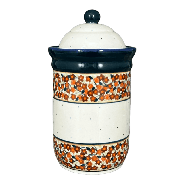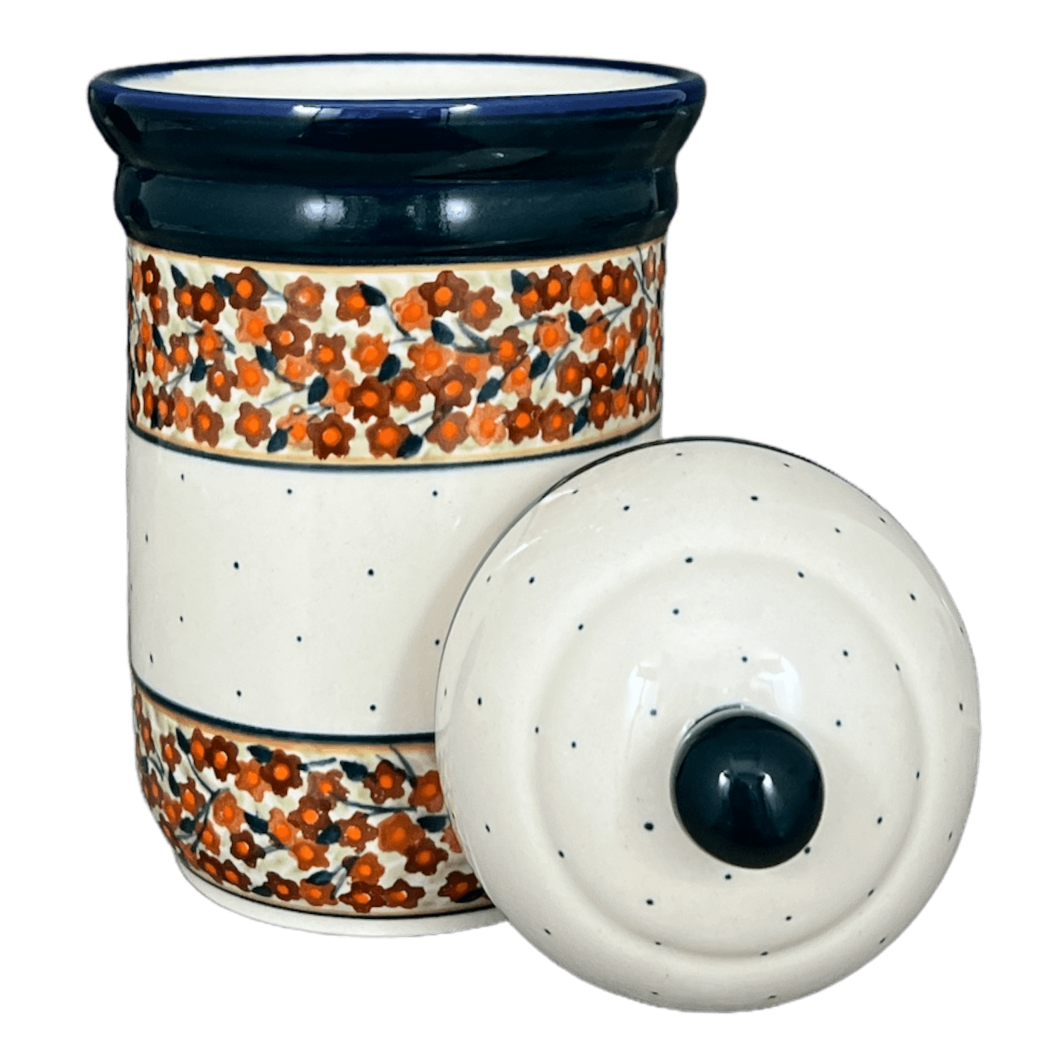 Introducing the enchanting Zaklady Polish Pottery Canister, a masterpiece that brings a burst of color and artistry to your kitchen! This 1-liter treasure, adorned in the vibrant "Orange Wreath" pattern, is not just a container but a celebration of craftsmanship. Picture a ring of sumptuous brown, orange, and gold flowers encircling lush green leaves, all set against a crisp white background speckled with tiny brown dots. This exquisite design, painted with meticulous attention to detail, transforms an ordinary canister into a stunning focal point on any countertop.