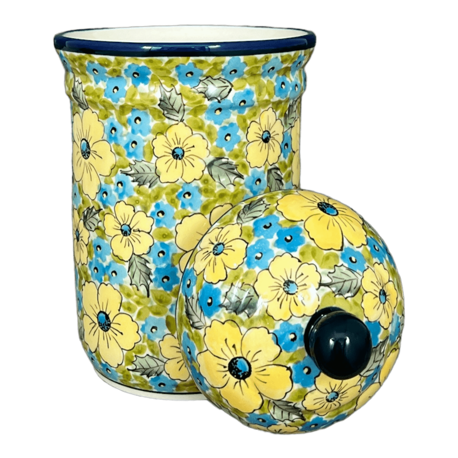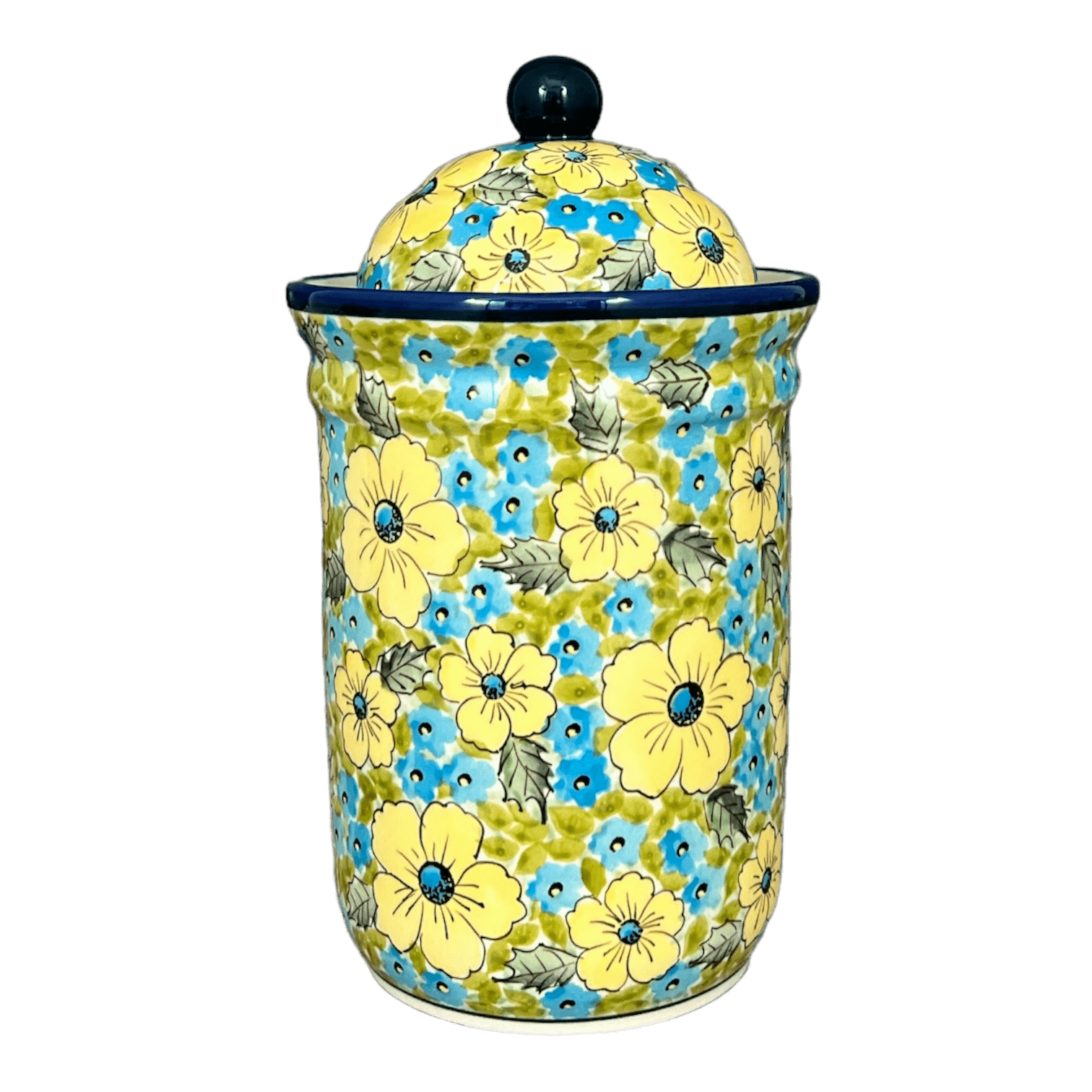 Imagine a splash of sunshine and a meadow full of vibrant flowers right on your kitchen counter! The Polish Pottery Canister from Zaklady, featuring the exquisite "Sunny Meadow" pattern, brings just that kind of cheerfulness into your home. This 1-liter treasure is adorned with large, sunny yellow blossoms and delicate blue flowers set against a fresh, green leafy backdrop. Hand-painted with meticulous care in Boleslawiec, Poland, this canister doesn’t just store your goods; it brightens your space and lifts your spirits with its vivid colors and pastoral charm.