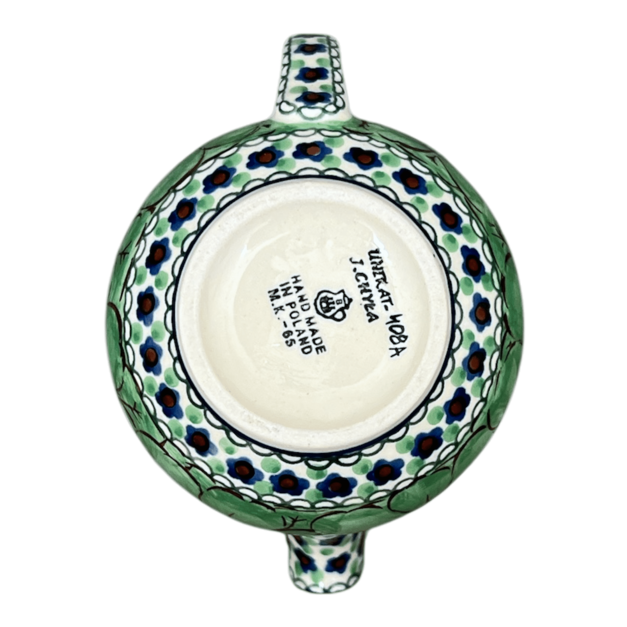 Imagine a splash of vibrant greens and serene blues gracing your table with the Polish Pottery Creamer, a delightful 10 oz pitcher crafted by the skilled artisans of Ceramika Artystyczna. This isn't just any creamer; it's a versatile gem that's perfect for everything from your morning milk to that rich, maple syrup on pancake Sundays, or even your secret recipe salad dressing. Dubbed the "Green Goddess" for its enchanting floral pattern, this piece features large, lively green flowers bordered by a constellation of tiny blue blossoms and swirling green and blue accents, transforming every use into a presentation worthy of admiration.