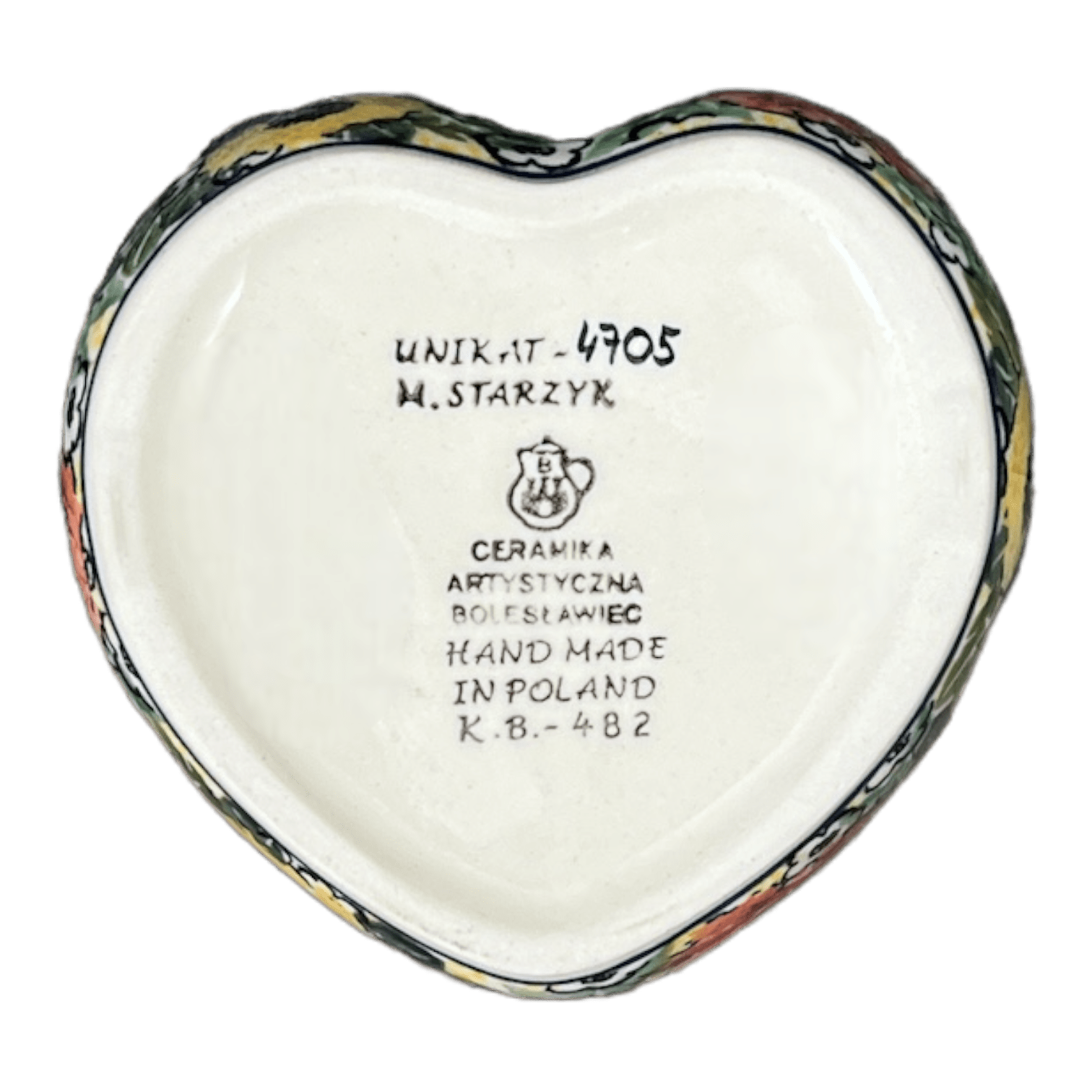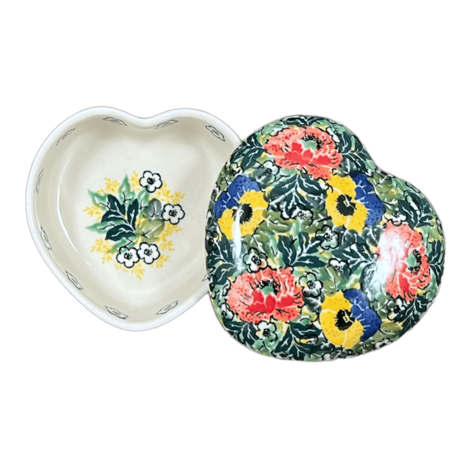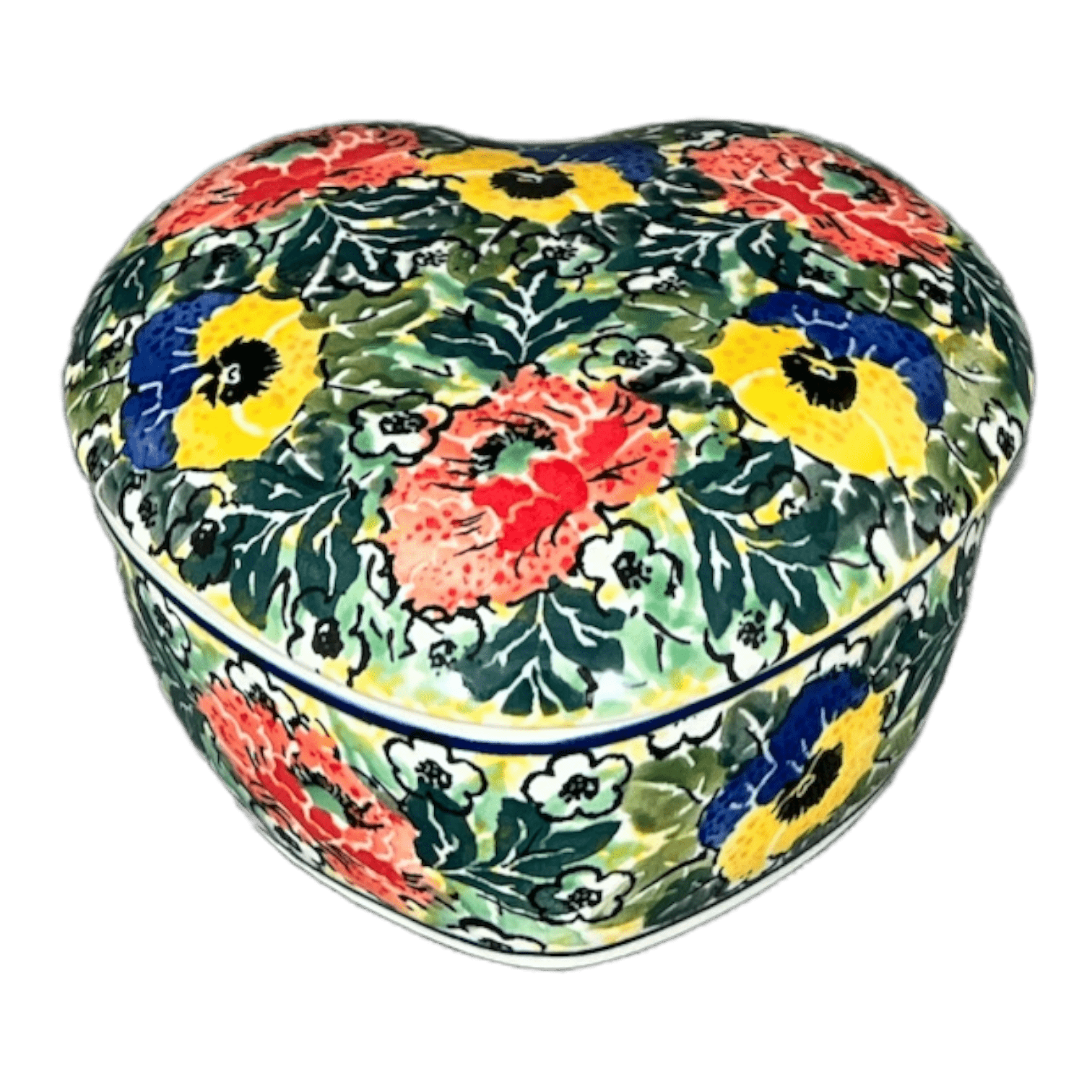 Imagine a little box that not only holds your precious trinkets but also tells a story of craftsmanship and tradition. That's what the Polish Pottery Heart Box from Ceramika Artystyczna offers. Each 4.5-inch heart-shaped box, lovingly adorned with the vibrant "Tropical Love" pattern, brings the essence of lush gardens into your home. Featuring large red, yellow, and blue flowers blossoming against a canvas of green leaves with petite white flowers peppered throughout, this box turns any ordinary storage into a delightful display. Whether you’re tucking away jewelry, serving up candy, or dishing out your favorite dips, this box adds a splash of color and charm to your space.