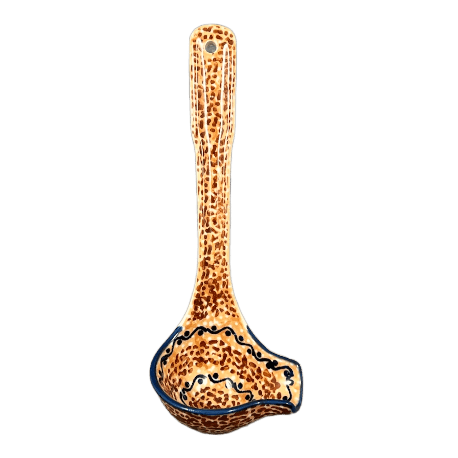 Introducing the exquisite Polish Pottery Ladle from Manufaktura, a masterpiece designed to elevate your dining experience! Crafted in the heart of Boleslawiec, Poland, by highly skilled artisans, this ladle isn't just a utensil—it's a piece of art. Featuring the vibrant "Desert Sunrise" pattern, this 7.5-inch gravy ladle showcases a mesmerizing blend of geometric shapes in a warm palette of brown, orange, blue, and yellow. The standout design includes an orange background with tightly packed tiny brown dots, encircled by a band of yellow suns casting blue rays, and a charming inner band of orange suns outlined with brown rays. This dazzling pattern is not only a visual delight but also a mark of unmatched craftsmanship, being classified as Unikat—indicative of the highest level of artistry in Polish pottery.