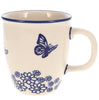 The "Butterfly Garden" pattern is a true delight for the eyes. With its predominantly white color and accents in blue, it features design elements that incorporate beautiful butterflies and flowers. The white background sets the stage for a band of delicate white flowers outlined in blue, stretching through the center from two adjacent corners. As you explore the pattern further, you'll find a few large butterflies gracefully scattered across the remaining 3/4 of the mug. It's a harmonious blend of nature-inspired artistry that will surely captivate your senses.