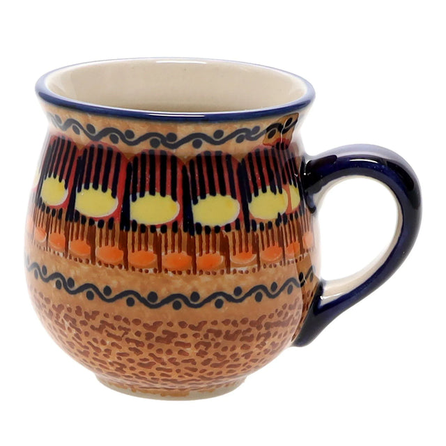 Imagine sipping your morning coffee or tea from a masterpiece that's as unique as a desert dawn. The "Desert Sunrise" Polish pottery belly mug by Manufaktura, not just any mug, it's a vibrant celebration of art and craftsmanship. This stunning piece features a mesmerizing pattern of geometric designs in a lively orange backdrop, speckled with tiny brown dots, and encircled by bands of radiant yellow and blue suns. Each sip feels like greeting the day with a splash of color and creativity, making every morning a little more magical.
