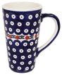 Imagine wrapping your hands around a mug that not only keeps your morning brew steaming hot but also brings a splash of artisanal charm right to your breakfast table. Introducing the John's Mug by Manufaktura, a 12 oz Polish pottery masterpiece crafted in the quaint town of Boleslawiec, Poland. This tall and slim mug is more than just a vessel for your coffee or tea; it's a piece of art, adorned with the whimsical "Mosquito" pattern. The design features playful white polka dots dancing on a vibrant blue background, bordered with alternating brown circles and teal green motifs that might remind you of tiny, buzzing mosquitoes.