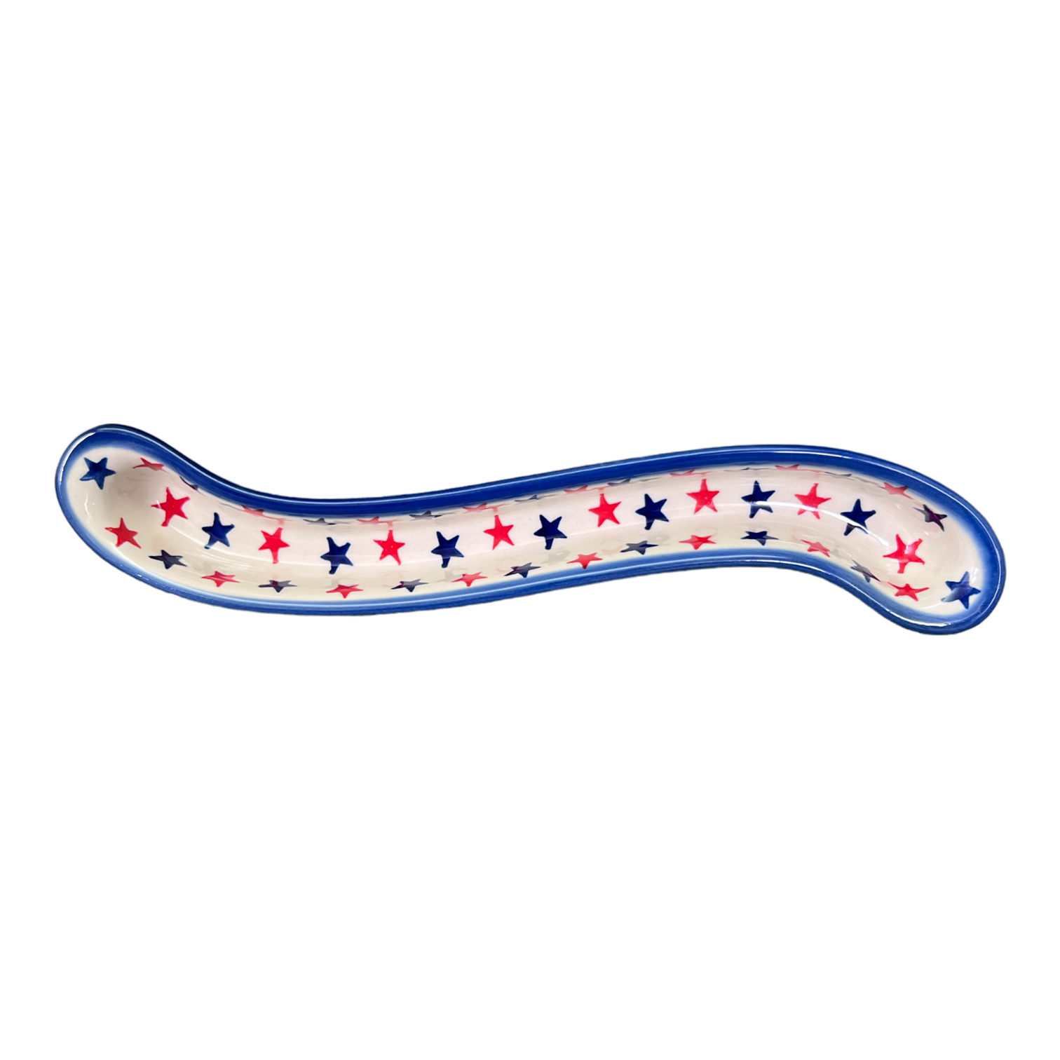 Introducing the stunning Polish Pottery 13" x 1.75" Curved Olive Boat by Andy in the captivating "Star Power" pattern! These curved olive boats offer a beautiful and unique way to serve olives or any other small hors d'oeuvres. With their exquisite design elements incorporating Stars in a predominantly Blue color with accents in White and Red, these olive boats are sure to catch the eye of your guests.