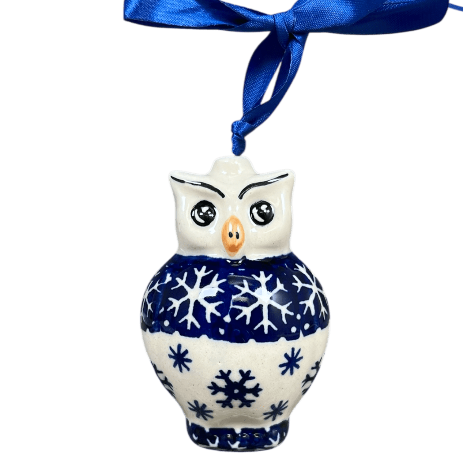 Imagine the whimsy of winter captured in the form of a charming little owl, perched gracefully on your Christmas tree. The Polish Pottery Ornament, crafted by the renowned artisans at Manufaktura, brings this magical vision to life. Each 2-inch ornament in the delightful "Snow Drift" pattern showcases a dance of white snowflakes fluttering over a serene blue background, embodying the tranquil beauty of a snowy winter's night. As these are hand-painted treasures, no two owls are exactly alike, each boasting its own unique flair and personality.