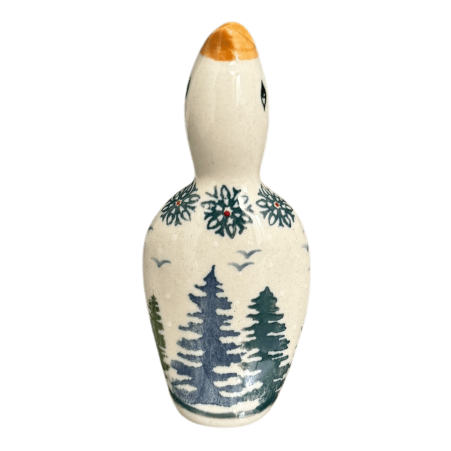 The "Pine Forest" pattern is a canvas of lush greens and soft dusty blues, evoking a tranquil forest blanketed in snow. Each piece features a delicate ring of green, snowflake-shaped flowers bordering the center, which is circled by stately pine trees set against a crisp white background. Small birds flutter subtly in the distance, bringing the serene forest scene to life. Crafted by Manufaktura's top-tier artists, who from inception to final touch, imbue each pie bird with a soul of its own. Recognized by the "UNIKAT" stamp of authenticity and the artist's signature, these pieces are not just kitchen aids but collector's items, promising both unmatched quality and unique design.