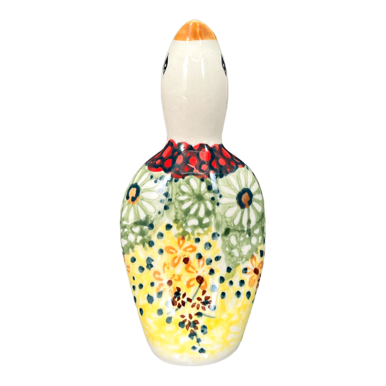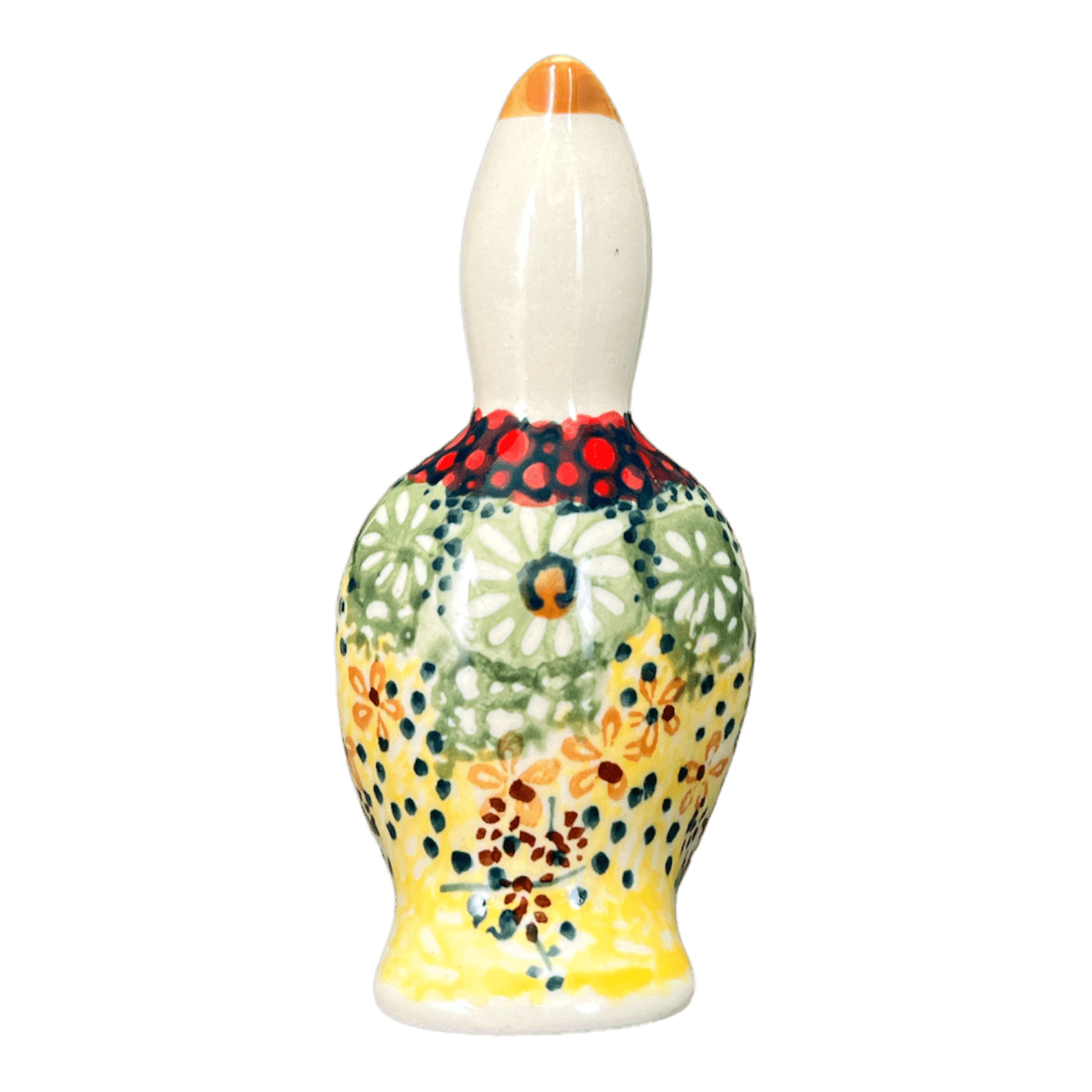 Imagine a delightful little pie bird, standing proud at 4 inches tall, hailing from the renowned Manufaktura workshop in the heart of Boleslawiec, Poland. This isn't just any pie bird; it's a masterpiece adorned in the "Sunshine Grotto" pattern, where sunny yellows merge with vibrant greens and pops of red to dance across its ceramic body. Flowers and dots play in a visual symphony, creating a cheerful scene that promises to turn your baking experience into an artful display. As it perches in your pie, this charming bird isn't just decorative—it's functional, too! It vents steam through its beak, ensuring your crust remains crisp and your filling perfect, without the dreaded bubble-over.