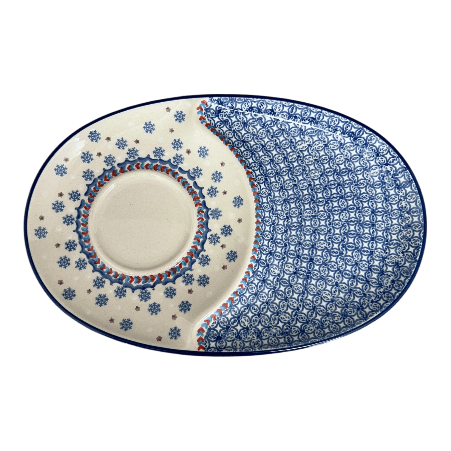 Imagine a chilly winter morning, where your breakfast table becomes a canvas of color and design, thanks to the stunning Polish Pottery Plate from Manufaktura. This oval plate isn't just any dish; it's a versatile masterpiece crafted in the charming town of Boleslawiec, Poland. Measuring 11.75" x 7.25", this plate features a cleverly integrated saucer perfect for cozy pairings like steamy soup and crispy sandwiches or coffee and buttery toast. Its delightful "Snowflake Love" pattern is adorned with whimsical tiny blue snowflakes sprinkled across a snowy white background, bordered by a series of loving blue and red hearts, transforming your meal into a festive experience.