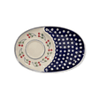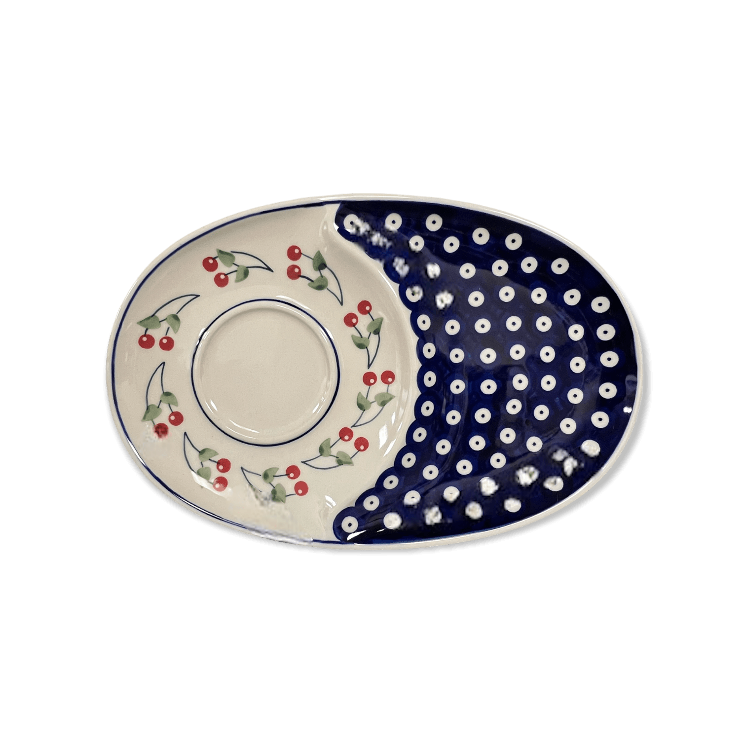 Imagine a plate that not only serves your favorite meals but also adds a dash of artistic flair to your dining experience. Enter the Polish Pottery Plate, Oval, Soup & Sandwich by Manufaktura, a marvel in the world of tableware. Crafted in the quaint town of Boleslawiec, Poland, this plate is not just a dish but a canvas, featuring the delightful "Cherry Dot" pattern. This design bursts with vibrant red cherries, perched on lush green stems, all beautifully set against a crisp white and polka-dotted blue background. It’s a traditional pattern that brings the charm of Polish folklore right to your table, perfect for any meal that needs a touch of whimsy and color.