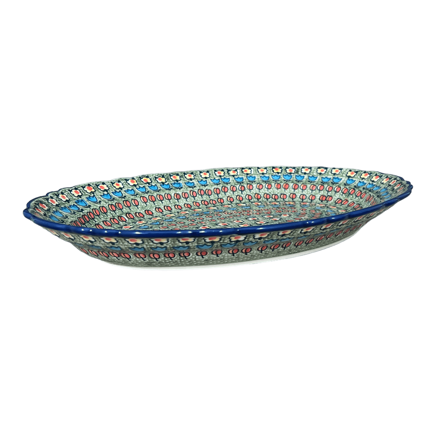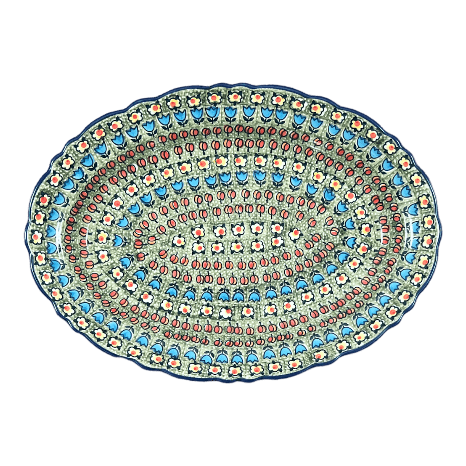 Imagine setting your table with a piece of art that dazzles the eyes and sparks conversation among your guests. The Manufaktura Polish Pottery Platter, with its lush "Amsterdam" pattern, does just that. Handcrafted in Boleslawiec, Poland, this exquisite platter features a scalloped oval design that is as functional as it is beautiful. The "Amsterdam" design is a canvas of vibrant green, adorned with simple white and orange flowers, light blue bellflowers, and red and orange berries, creating a harmonious symphony of colors that bring life to any dining occasion.