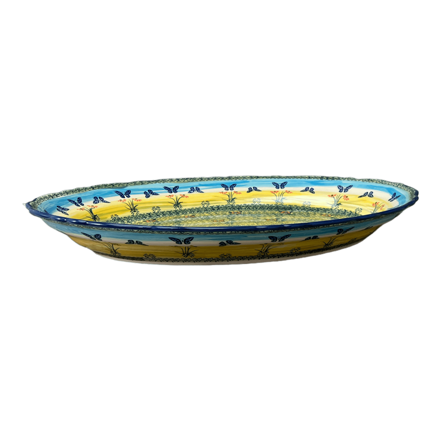 Imagine serving a feast on a masterpiece that captures the essence of a whimsical garden! The Manufaktura Polish Pottery Platter, adorned with the enchanting "Butterflies in Flight" pattern, transforms every meal into a vibrant celebration. This large, scalloped oval platter, measuring a generous 16.75" x 12.25", is not just a dish but a portal to a world where butterflies dance mid-air and flowers bloom in radiant hues. The delicate artwork, predominantly in blues with splashes of yellow, green, and orange, showcases small detailed orange flowers and tiny teal grass tufts, creating a captivating visual feast as appealing as your culinary creations.